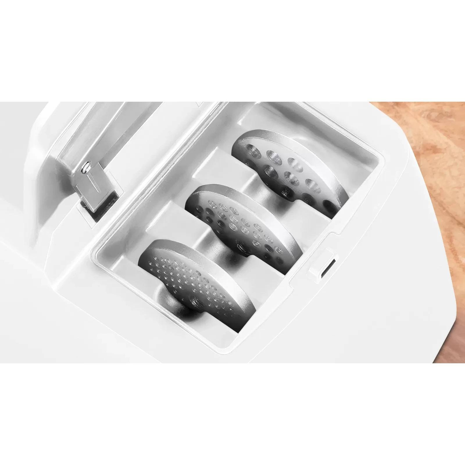 چرخ گوشت BOSCH MFW45020 دارای سه عدد شبکه در سه سایز ریز، متوسط و درشت است. جنس استیل، سطح بهداشتی و تمیز کردن آسان از ویژگیهای شبکههای چرخ گوشت است. دستگاه به لطف پایه پلاستیکی در زیر آن تعبیه گردیده به صورت محکم روی میز قرار میگیرد و هیچ گونه لغزشی ندارد. حمل و جابهجایی چرخ گوشت به دلیل داشتن دستهای که در بالای آن وجود دارد، آسان شده است.