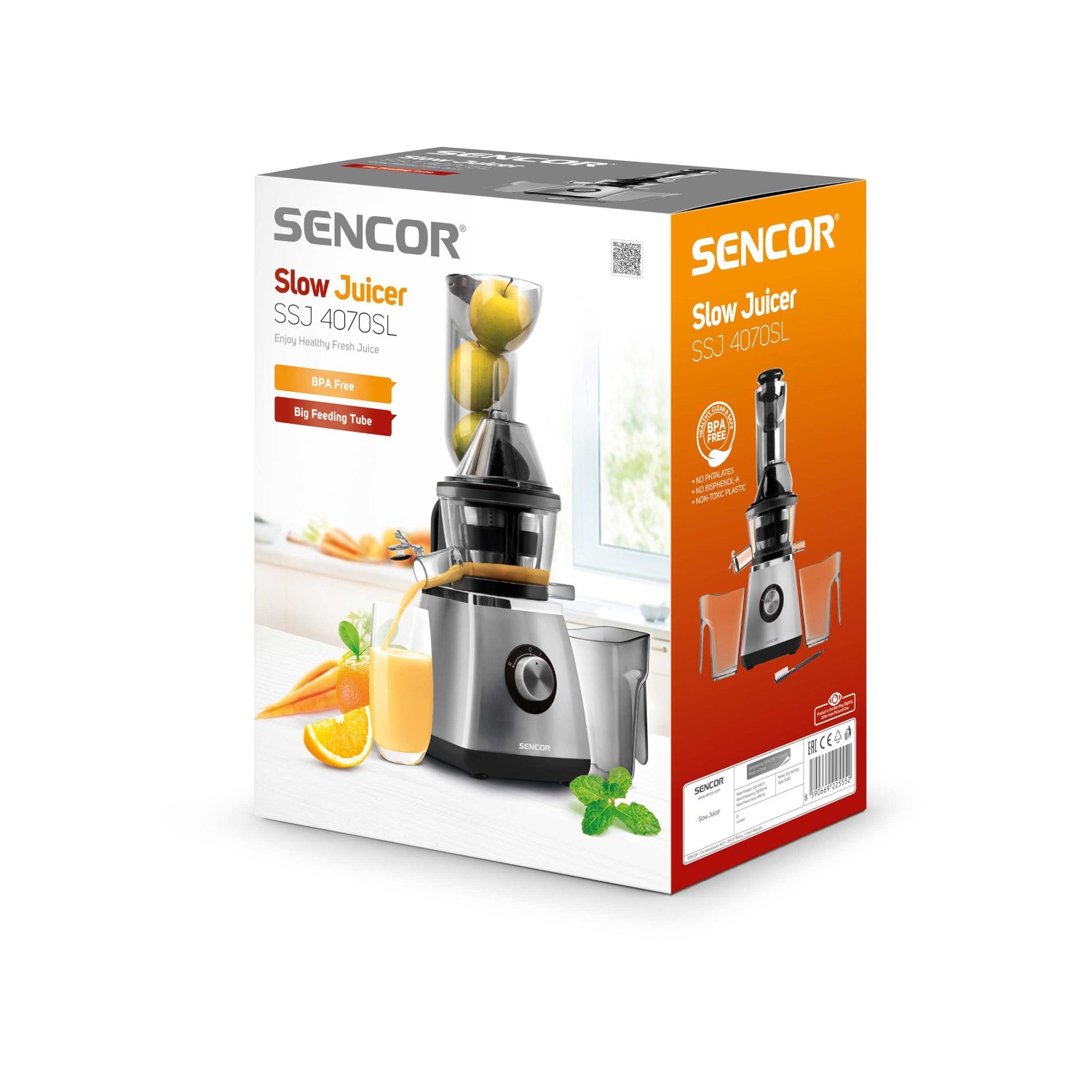 عصاره گیر سنکور مدل SSJ 4070SL دارای یک موتور با عملکرد سریع 60 دور در دقیقه، توانی معادل 400 وات و سطح صدایی به اندازه ی 70 دسی بل است. این دستگاه به شما کمک می کند تا بتوانید به وسیله ی آن آب انواع میوه ها را گرفته و از نوشیدن آن لذت ببرید. سرعت آهسته ی دستگاه به حفظ همه ی ویتامین ها و آنزیم های میوه در هنگام آبمیوه گیری کمک می کند. این آبمیوه گیر به رنگ نقره ای است و با ابعاد مناسب به راحتی در فضای هر آشپزخانه ای جا می گیرد.