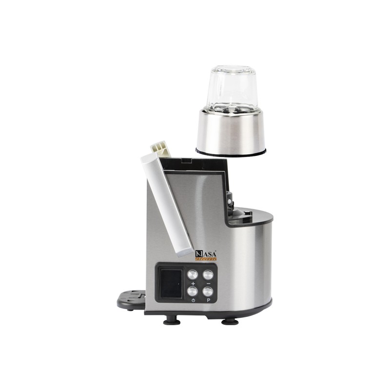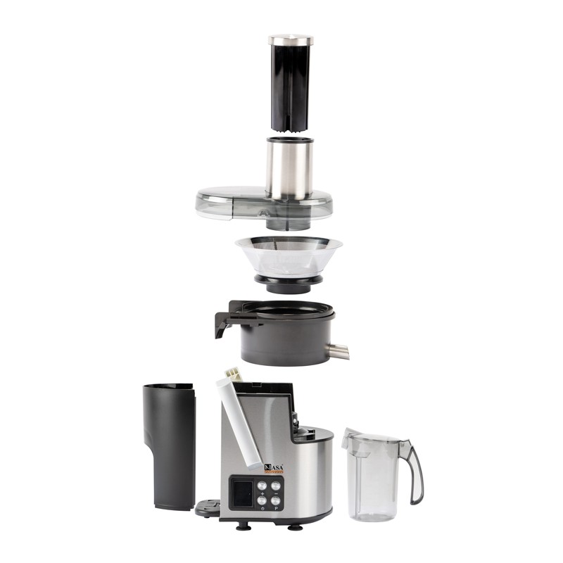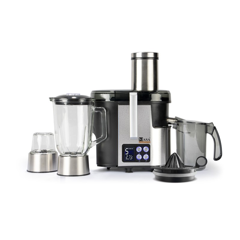 آبمیوه گیر چهار کاره Nasa electric NS945 از صفحه دیجیتالی LED بهره می برد که ظاهری مدرن به آن بخشیده و کار کردن با آن را بسیار ساده کرده است. این وسیله دارای 5 حالت برای سرعت و عملکرد پالس است که بسته به نوع مواد خود می توانید یکی از آنها را انتخاب نمایید. مخزن 2 لیتری تفاله به بدنه چسبیده و از جنس پلاستیک است. سایز دهانه ورودی آبمیوه گیری 80 میلی متر بوده که مناسب هر اندازه و مقدار میوه است. پارچ مخصوص آبمیوه گیر از جنس پلاستیک بوده و 1 لیتر ظرفیت دارد. میتوان قطعات دستگاه را به سادگی از هم جدا کرد و شستشو داد.