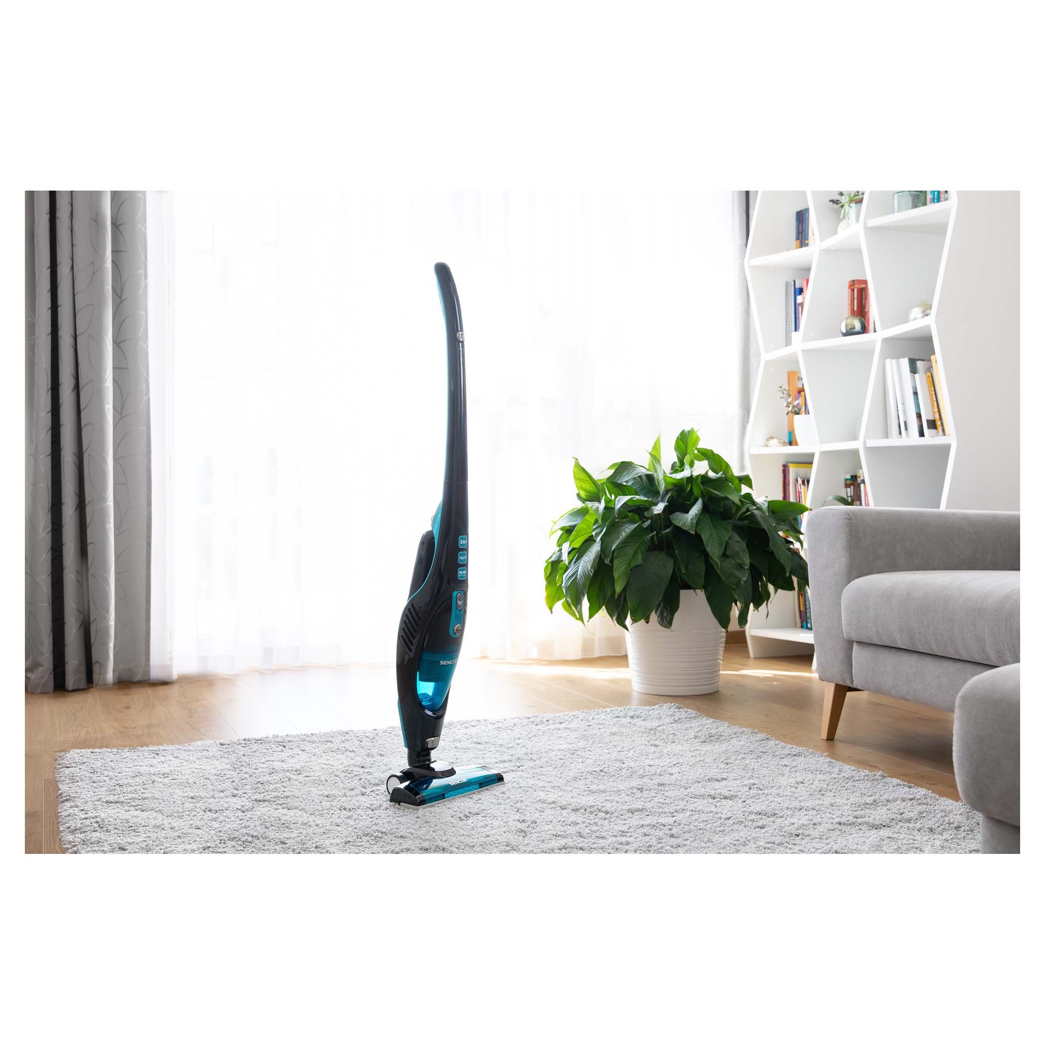 جارو شارژی سنکور مدل SVC 7614 TQ به دو حالت ایستاده و دستی مورد استفاده قرار می گیرد و از آن حتی برای تمیزکاری داخل اتومبیل هم می توانید استفاده کنید. سری های این دستگاه شامل یک برس چرخان اصلی، برس تلسکوپی برای تمیز کردن فضاهای باریک مانند بین تشک مبل و سری فرچه ای برای استفاده روی سطح مبل است. علاوه بر این ها چراغ های LED طراحی شده در قسمت جلویی پارویی، دید شما را به خصوص در هنگام تاریکی بهتر می کند تا هیچ کثیفی و گرد و غباری باقی نماند.
