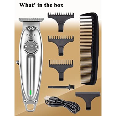 تیغه های ماشین اصلاح KM-1949 خودتیزشو می باشند و از جنس استیل ضدزنگ carbon steel می باشد و در هنگام استفاده های طولانی این تیغه ها داغ نخواهند شد. بهتر است دستگاه را در معرض آب قرار ندهید و تیغه های آن را به وسیله براش همراه ریش تراش تمیز نمایید و به صورت منظم روغن کاری کنید. به همراه این ریش تراش 3 عدد شانه به سایز های 1 و 2 و 3 میلی متر ارائه خواهد گشت. تمام موارد همراه این ریش تراش در شکل زیر موجود است :