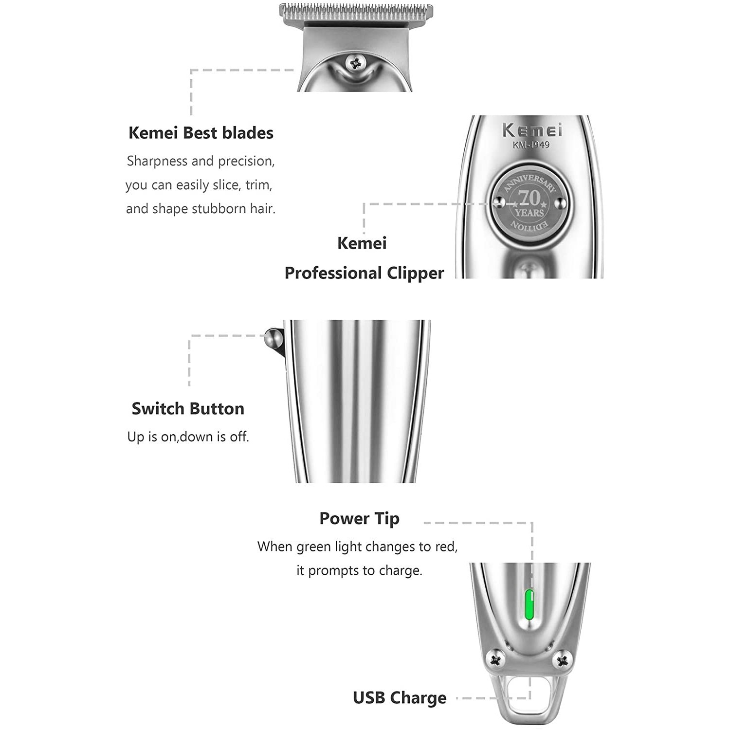 ماشین ریش تراش کیمی KM-1949 دارای موتوری قدرتمند و بادوام است. این موتور سرعت ۶۴۰۰ تا ۶۹۰۰ rpm را در جهت برش تولید می کند و صدا و نویز کمی تولید می کند و توانایی برش ضخیم ترین موها را بدون مشکل دارد. ساخت زیبا و با کیفیتی دارد و بدنه آن از جنس فلز مرغوب ساخته شده و دارای طراحی ارگونومیک می باشد که برای استفاده های طولانی مدت ، مخصوصا برای آرایشگران عزیز ایجاد خستگی دست نمی کند.