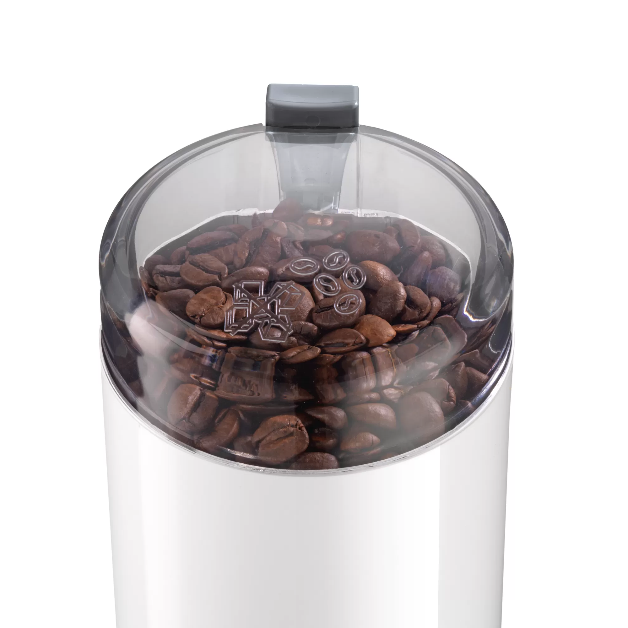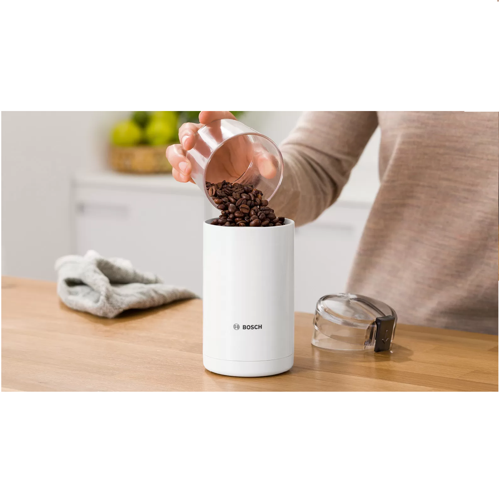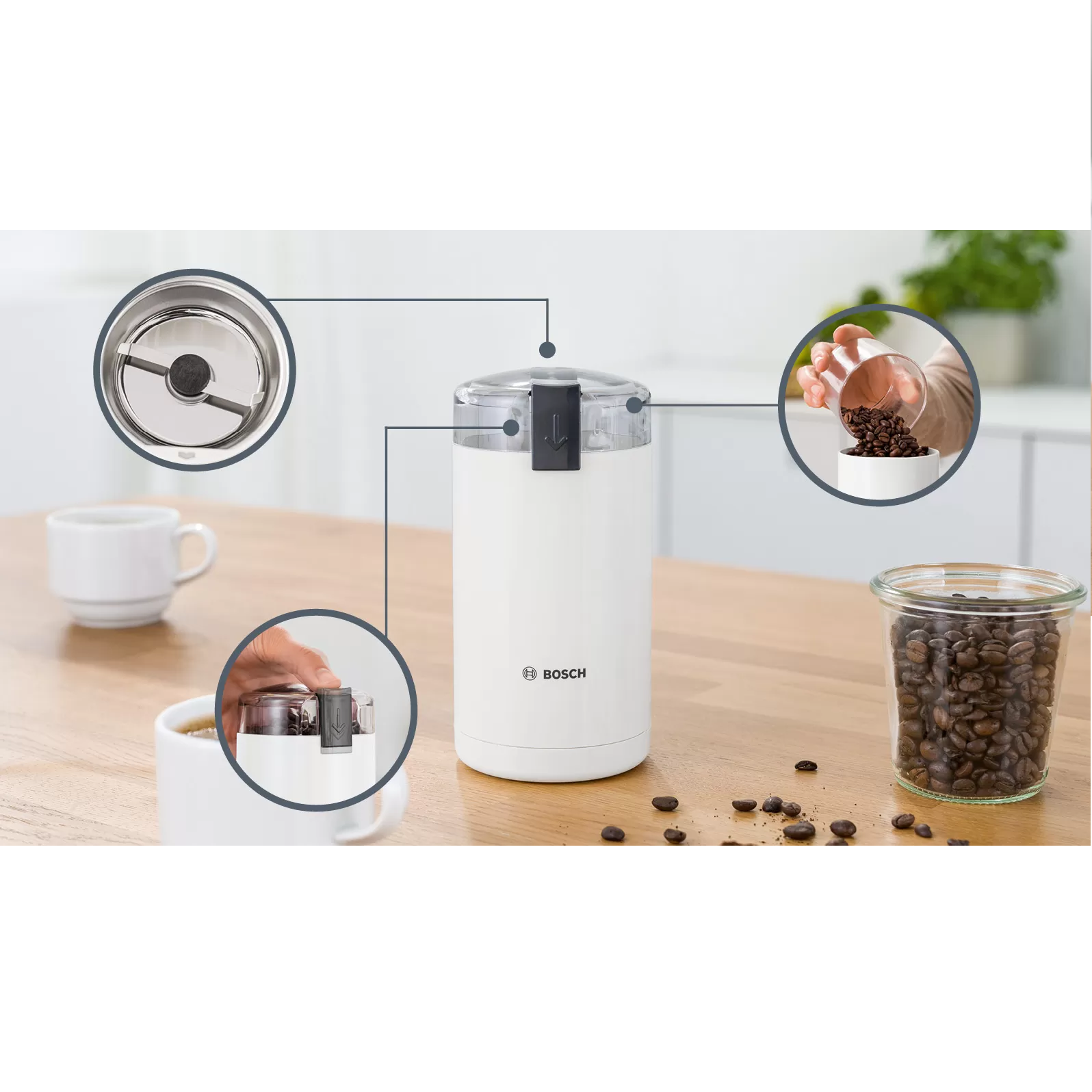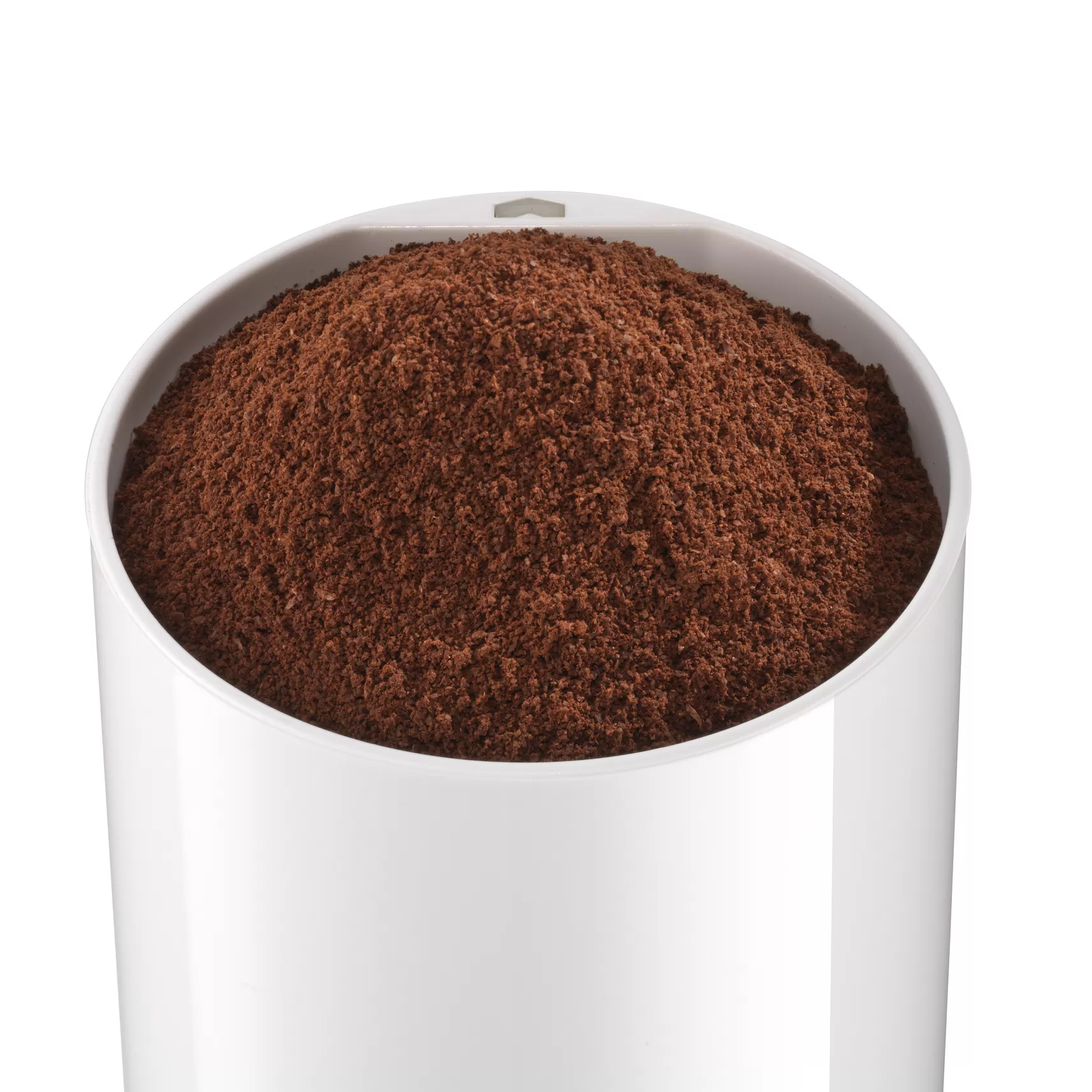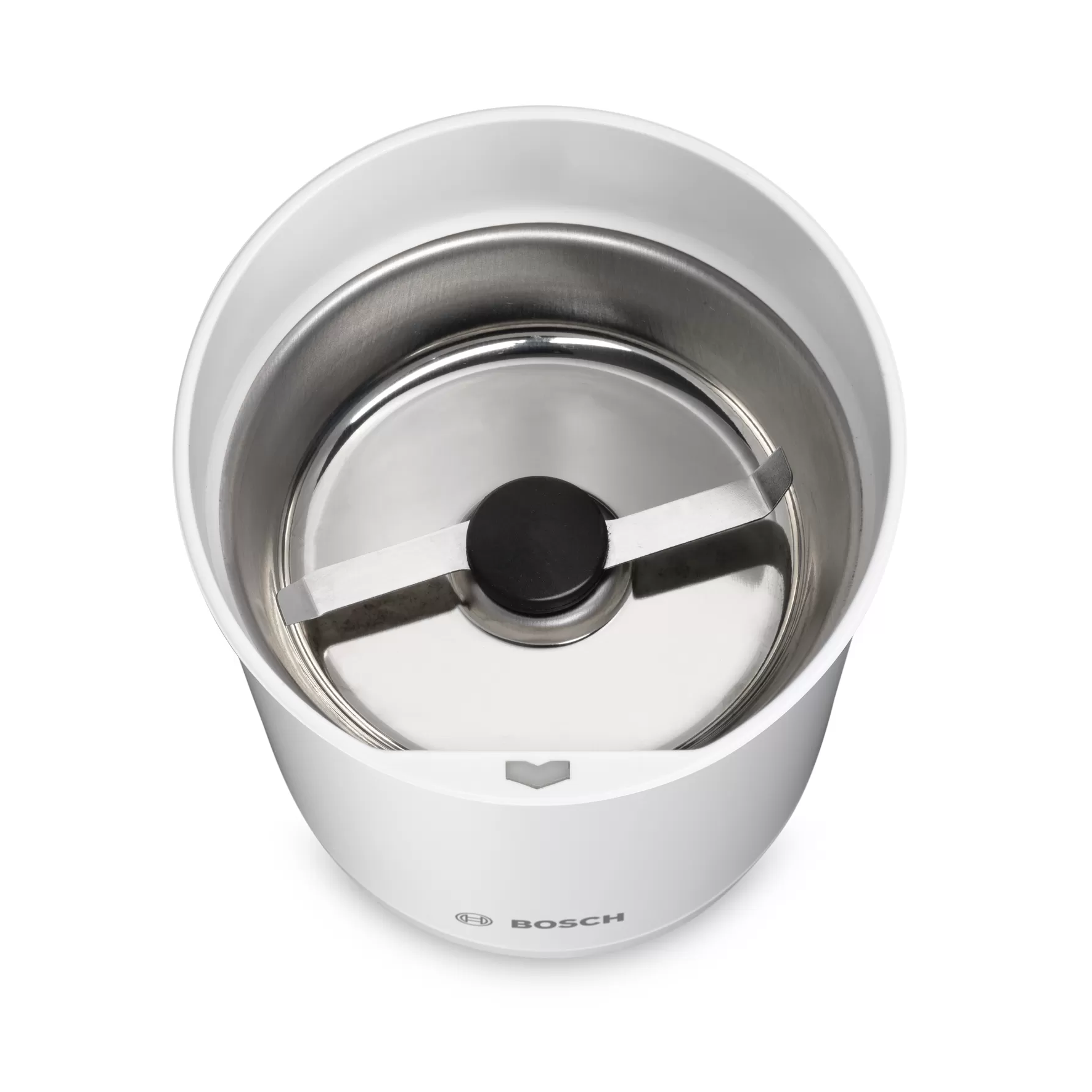 مخزن و تیغه آسیاب بوش مدل TSM6A011W از جنس استیل ضد زنگ ساخته شده اند. دستگاه دارای دو عدد تیغه بوده که با دقت بالا هر ماده ای را آسیاب می کند. گنجایش این آسیاب برای 75 گرم دانه قهوه مناسب است که به اندازه تهیه یک لیوان کامل قهوه است. درپوش شفاف این دستگاه به شما این امکان را می دهد که فرآیند آسیاب و پودر شدن دانه ها را مشاهده کنید تا به اندازه ایده آل شما آسیاب شوند.
