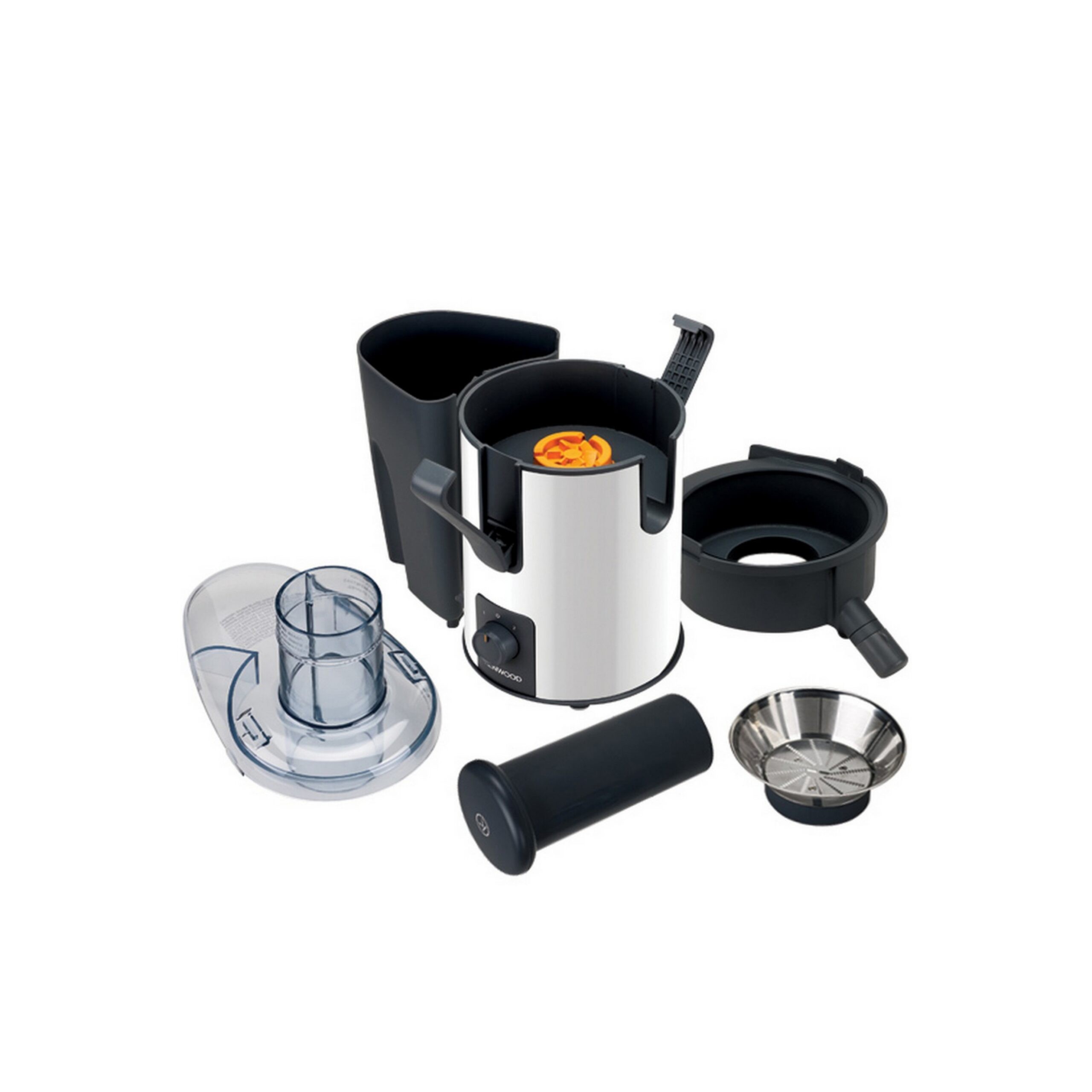 آبمیوه گیری کنوود مدل JEM500SS یکی از بهترین محصولات این شرکت می باشد که به شما در تهیه آبمیوه های خوشمزه کمک می کند. این محصول از توان 700 واتی برخوردار بوده و دارای 2 سرعت متفاوت می باشد که از طریق ولوم چرخشی که روی بدنه تعبیه شده، قابل تنظیم است. این دستگاه قابلیت آبگیری انواع میوه های نرم و سخت را دارد. روی این دستگاه، یک دهانه بزرگ 75 میلی متری وجود دارد که امکان وارد کردن تکه های درشت میوه را به راحتی فراهم می کند.