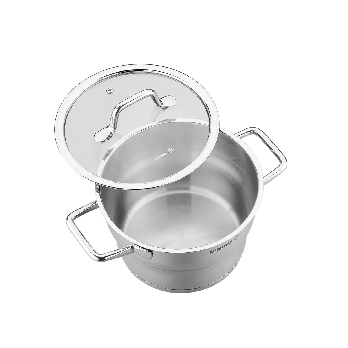 سرویس قابلمه کرکماز مدل فستیوا FESTIVA A1957 محصولی از برند زیبای KORKMAZ ترکیه است. این سرویس 8 پارچه شامل 3 قابلمه با درب و 1 ماهیتابه دو دسته با درب می باشد. جنس این سرویس از استیل ضد زنگ 10\18 است هم دارای مقاومت بالا در برابر صدمات احتمالی و حرارت بالا است و هم دارای سطحی براق و زیبا می باشد. جنس دسته درب و دستگیره های قابلمه ها نیز از استیل ضد زنگ هستند. نوع اتصال دستگیره ها به گونه ای است که در اثر حرارت داغ نمی شوند. درب های سرویس قابلمه کرکماز مدل 1957 نیز از شیشه با دور استیل است و همچنین دارای دریچه تخلیه بخار برای سر نرفتن غذا می باشند.