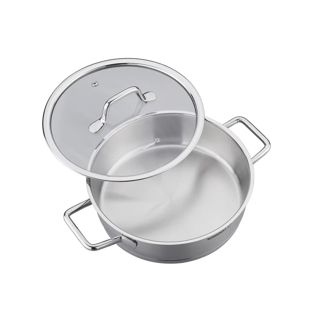 سرویس قابلمه KORKMAZ FESTIVA A 1957 دارای 3 قابلمه در سایزهای 11.5*16، 12.5*20 و 14*24 سانتی متر با حجم های 2، 3.5 و 5.5 لیتر و 1 ماهیتابه در سایز 7*24 سانتی متر با حجم 3 لیتر است. این سرویس به لطف سیستم پایه خورشیدی که دارد دارای بالاترین سطح انتقال حرارت را در انواع اجاق ها از جمله القایی فراهم می کند که موجب صرفه جویی در زمان و انرژی می شود. درب ها در این سرویس بسیار مسطح هستند و برای چیدمان فوق العاده ایده آل و در ماشین ظرفشویی کمترین فضا را اشغال می کنند.