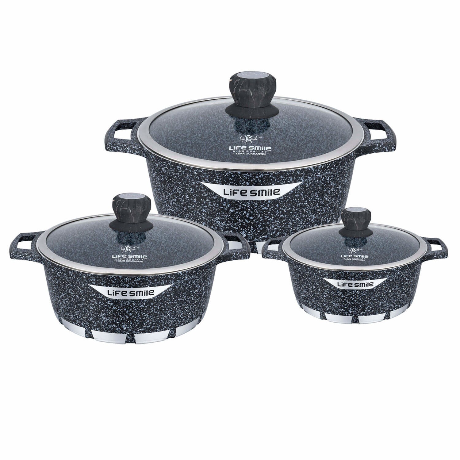 سرویس قابلمه LIFESMILE FLCM-6 Cookware Set داری یک درب شیشه ای است که این امکان را به شما می دهد تا مواد را در هنگام پخت مشاهده نمایید. دسته ی درب قابلمه از جنس باکالیت است که در برابر حرارت و گرما از مقاومت بالایی برخوردار است. دستگیره های این مدل سرویس 6 پارچه لایف اسمایل قالب دار و از جنس بدنه می باشد.