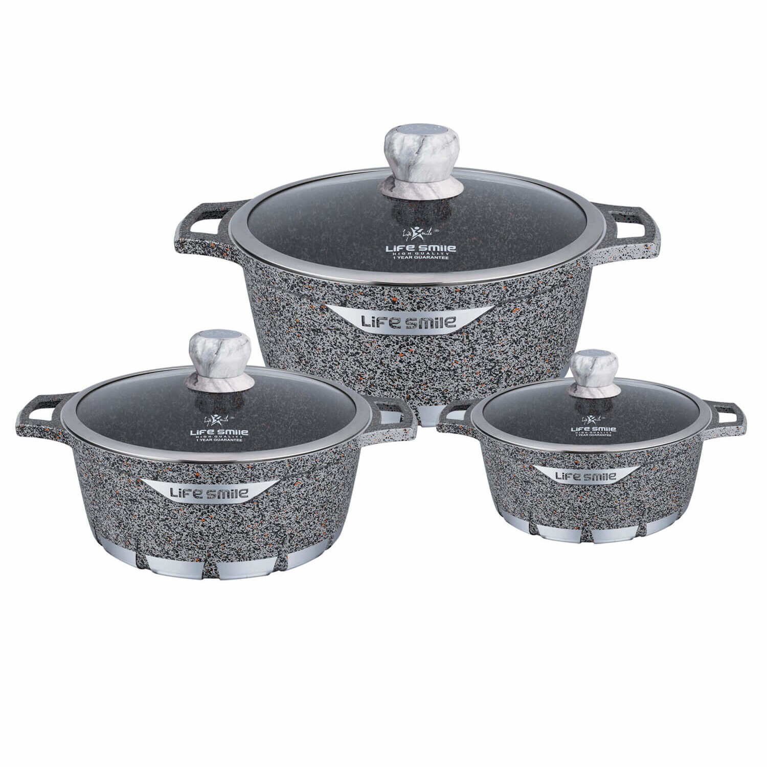 سرویس قابلمه گرانیتی لایف اسمایل مدل FLCM-6 از محصولات زیبا و با کیفیت برند LIFESMILE می باشد. بدنه قابلمه ها از جنس آلومینیوم تولید گردیده که به دوام، استحکام و ماندگاری بیشتر آن ها کمک می کند. این مدل قابلمه دارای پوشش گرانیتی بوده که ترکیبی از تفلون و سرامیک می باشد که مقاومت سطح داخلی آن را در برابر خراشیدگی بالا می برد. سطح صاف و نچسبی را در قسمت داخلی قابلمه ایجاد می کند تا افراد به راحتی بتوانند مواد را بعد از پخت از قابلمه خارج نمایند.