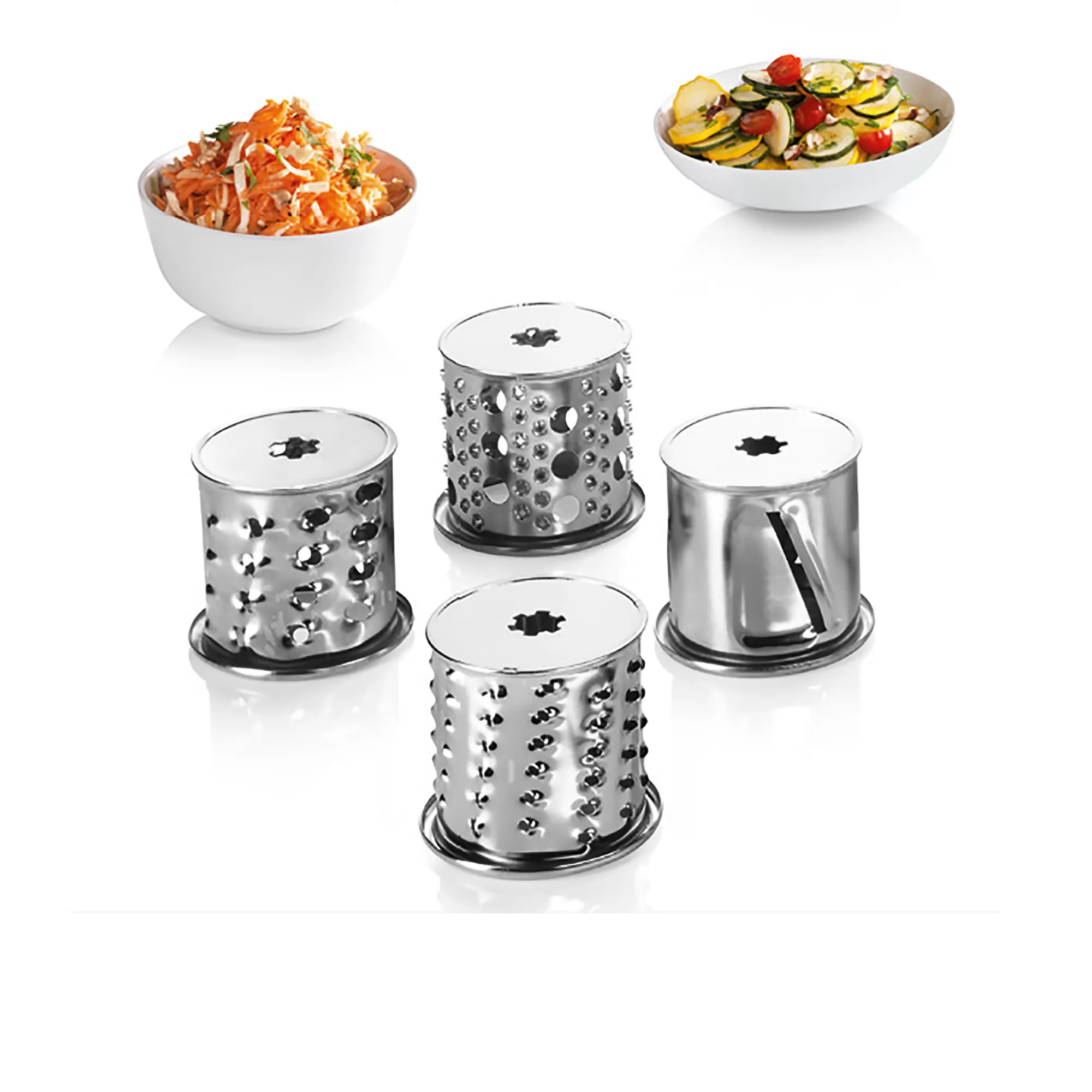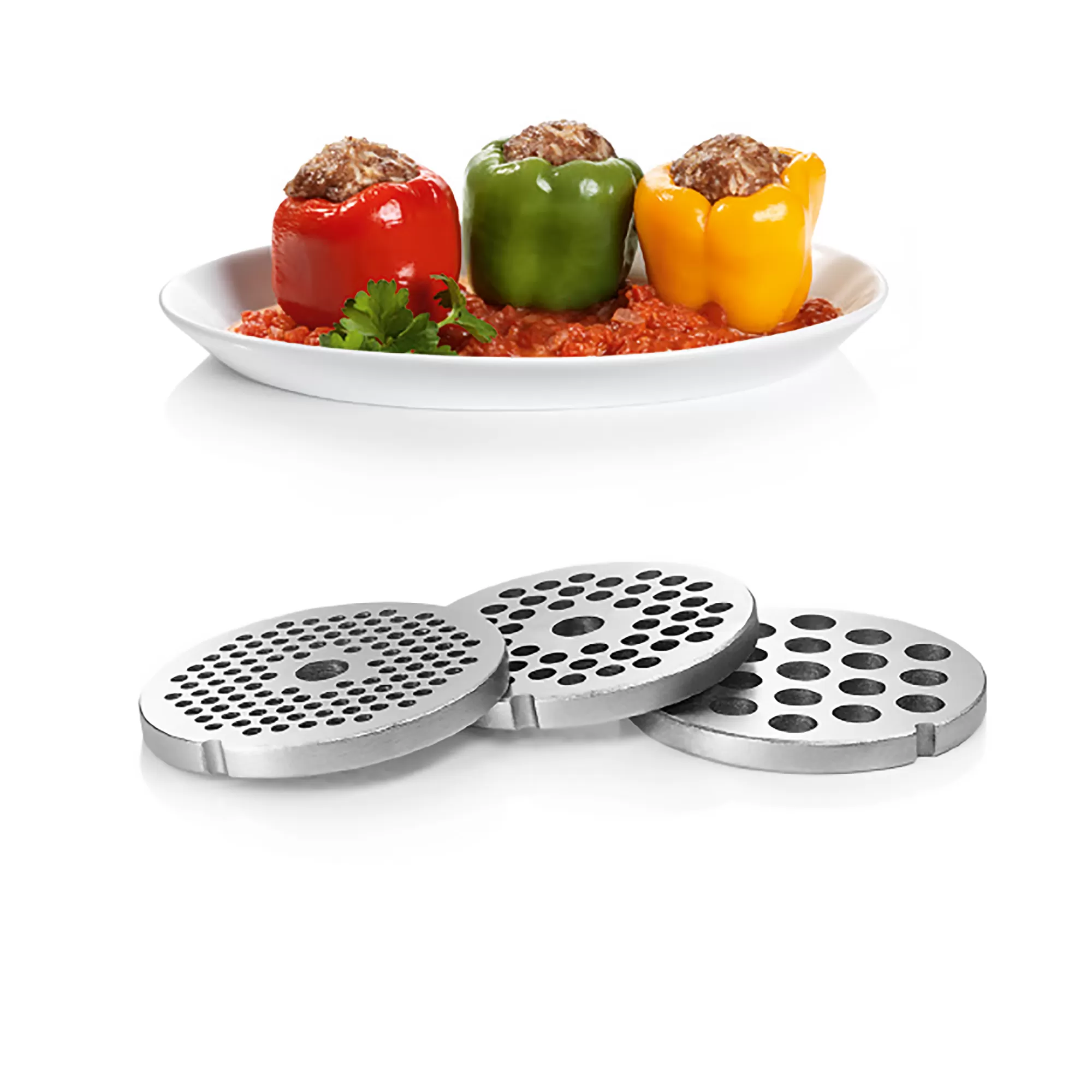 چرخ گوشت BOSCH MFW68660 دارای چندین سری با کارایی های مختلف است. شبکه ها از جنس استیل ضد زنگ ساخته شده اند و از آن ها برای چرخ نمودن گوشت در سه سایز ریز، متوسط و درشت استفاده می شود. همچنین با استفاده از سری سالادساز می توانید از تیغه های رنده ریز، متوسط، درشت و حلقه کن برای تهیه انواع سالاد بهره ببرید.