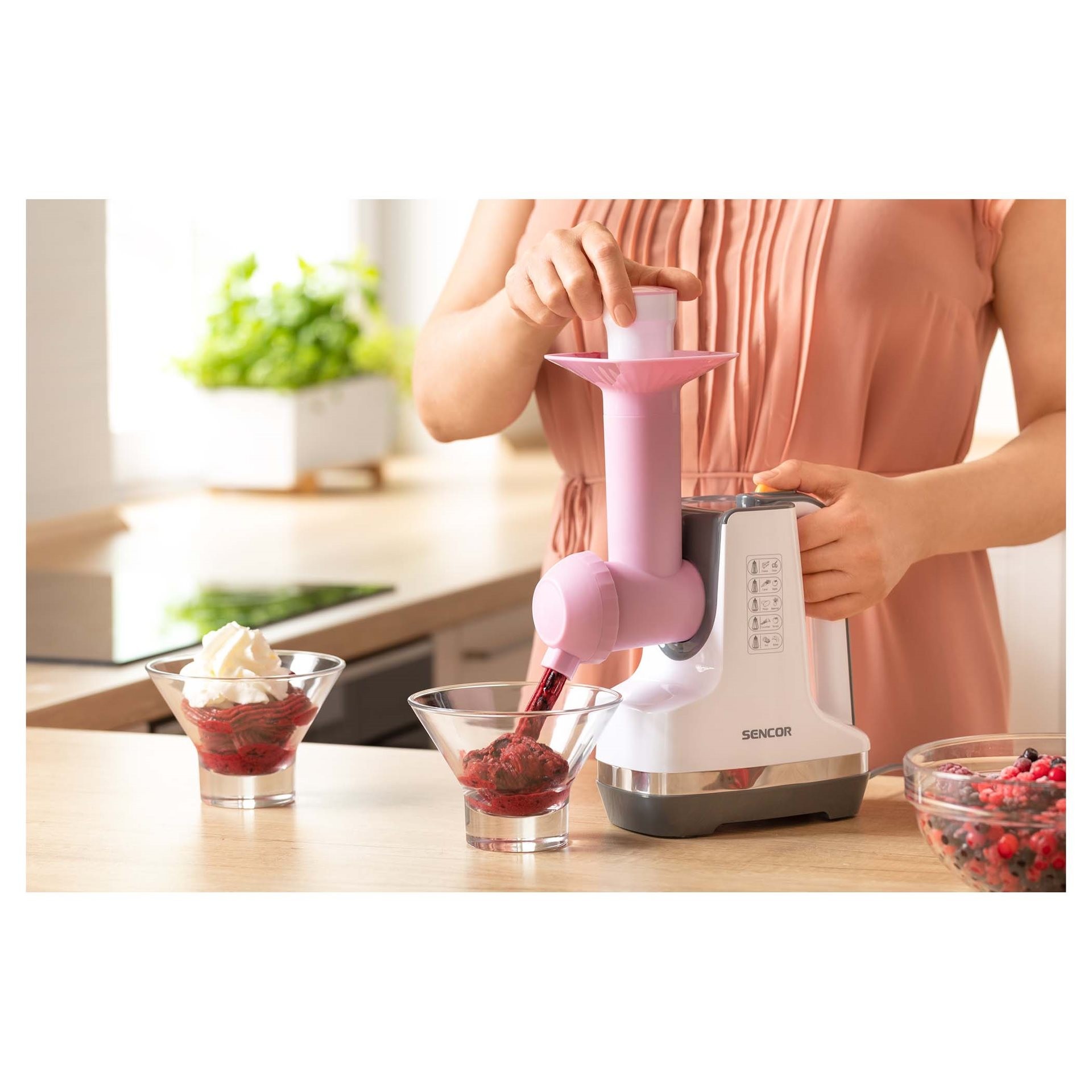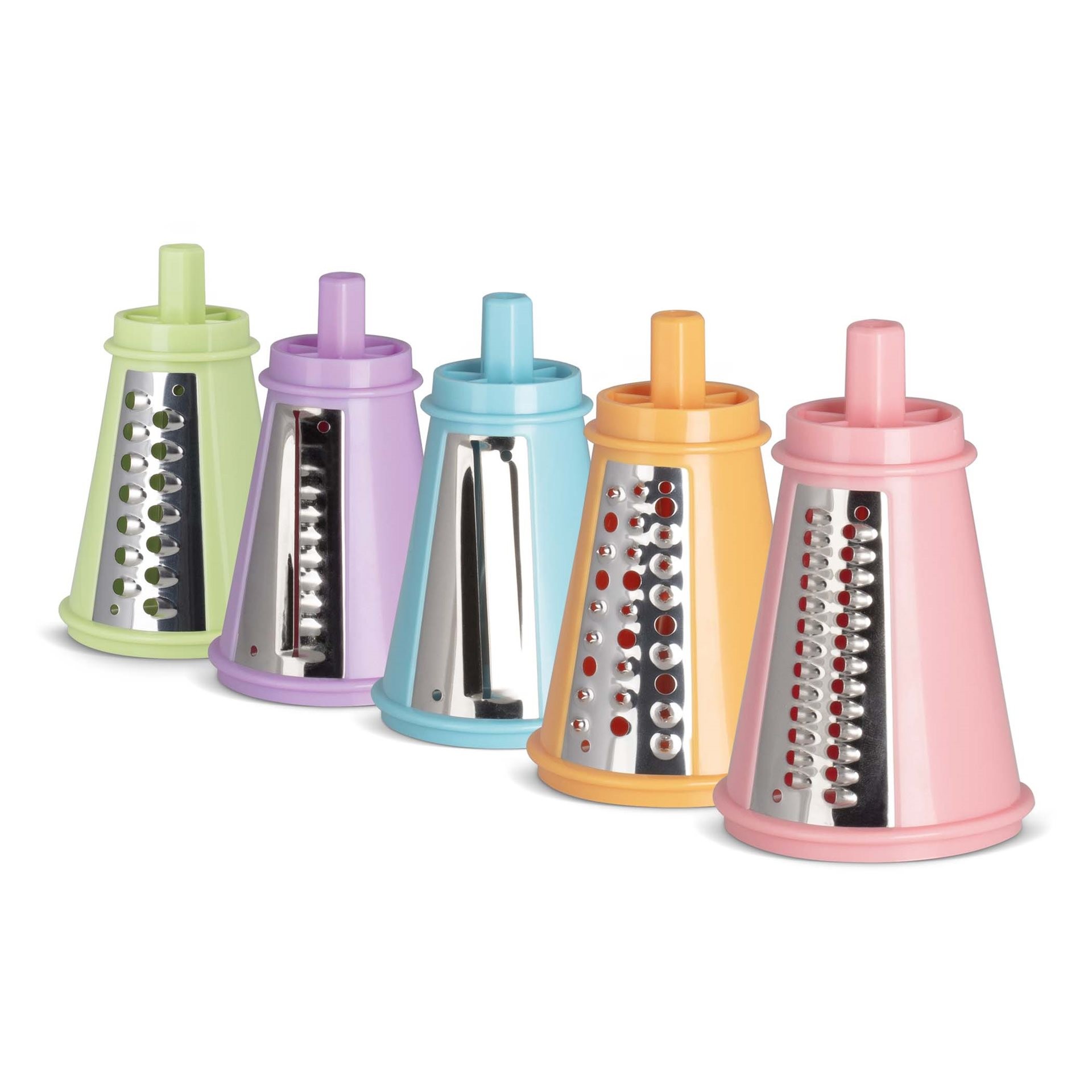 رنده برقی سنکور مدل SSG4500WH دارای یک قطعه بستنی ساز پلاستیکی و 5 نوع رنده قابل تعویض از جنس استیل ضد زنگ و به شکل ناودانی است که به کمک آنها میتوان عملکردهای زیر را با آنها انجام داد: