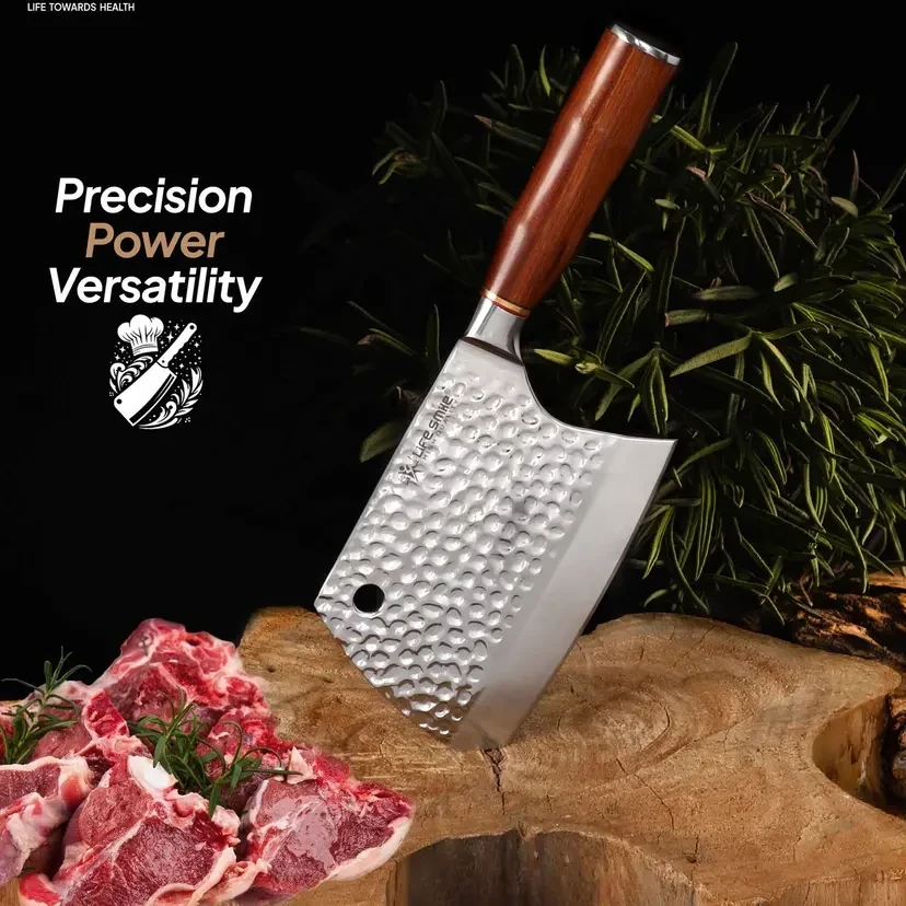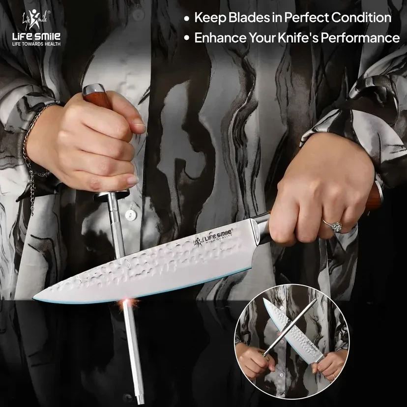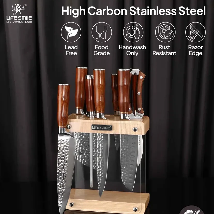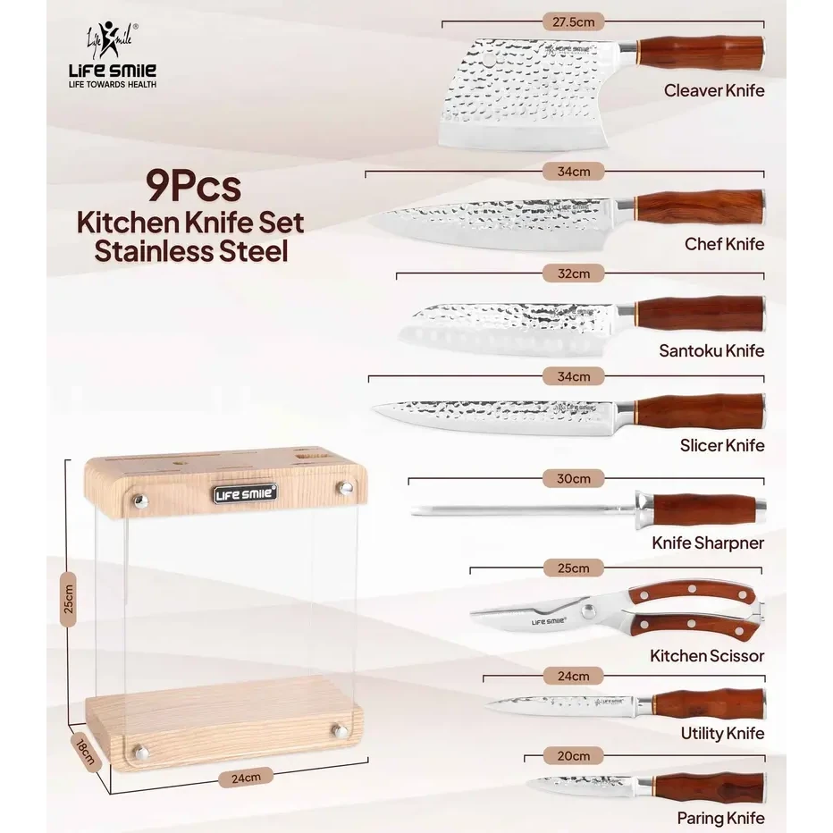 سرویس چاقو LIFE SMILE NSEL-18 دارای 9 پارچه شامل ساطور، چاقوی سرآشپز، چاقوی برش دهنده، چاقوی سانتوکو، چاقوی عمومی، چاقوی پوست کندن، قیچی، ابزار تیز کردن و پایه نگهدارنده است.
