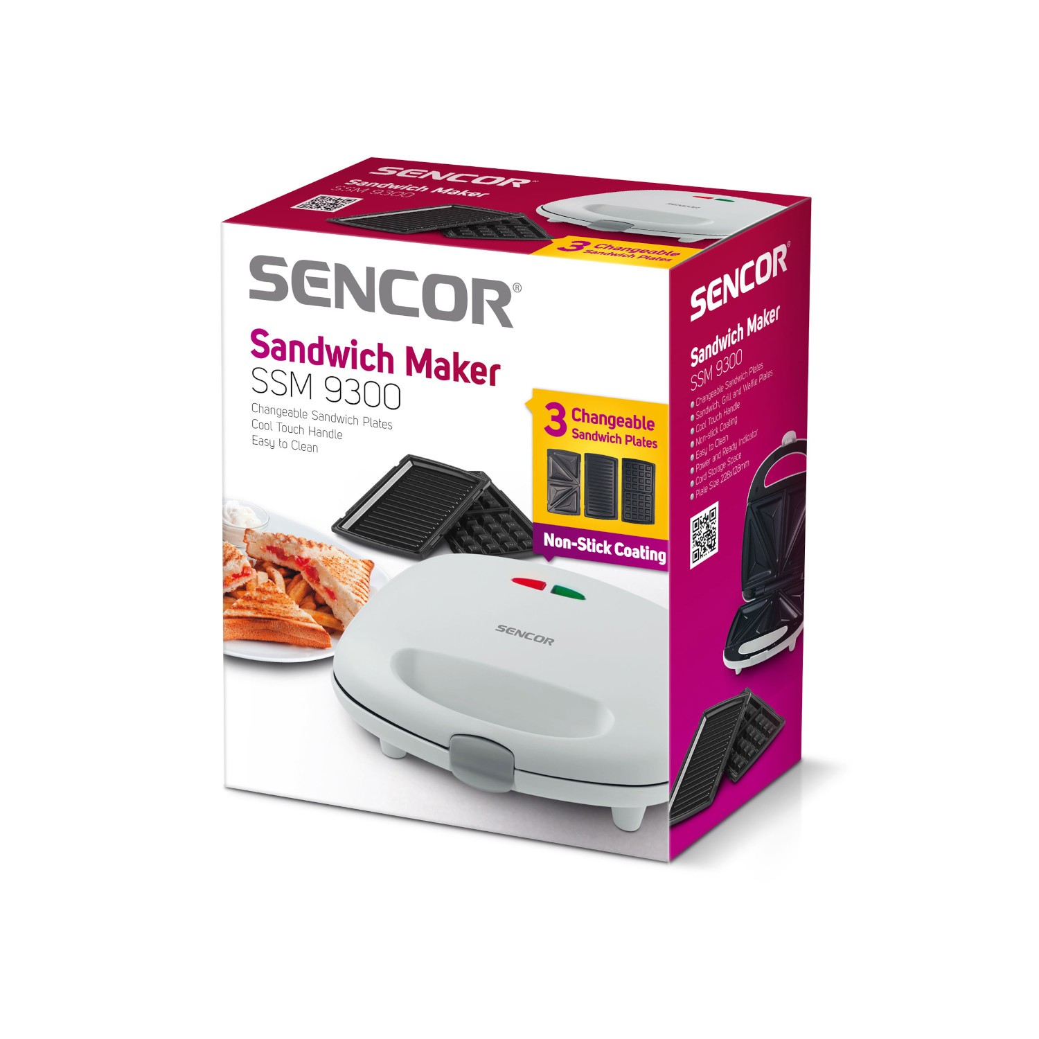 جنس بدنه و دسته ی دستگاه Sencor SSM 9300SS Sandwich Maker از پلاستیک مرغوب ساخته شده که عایق حرارت و گرما می باشد. این مدل دستگاه دارای سیستم کنترل حرارتی خودکار است. رنگ بدنه ی دستگاه ساندویچ ساز 3 کاره سنکور مدل SSM9300SS کاملاً سفید می باشد که بر روی بدنه ی این دستگاه دو چراغ نشانگر به رنگ قرمز و سبز وجود دارد. زمانی را که دستگاه به برق متصل است نشانگر یا چراغ قرمز روشن می شود و چراغ سبز زمان آماده به کار بودن آن را نمایش میدهد.