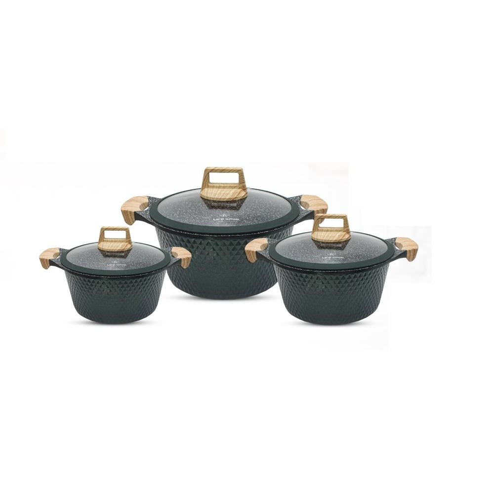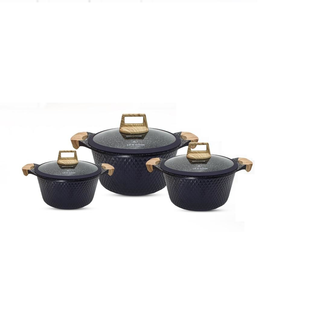 سرویس LIFE SMILE MR-6 دارای 3 قابلمه در سایزهای 20، 24 و 28 سانتی متر با حجم های 2.7، 4.3 و 6.5 لیتر است. درب این قابلمه ها از جنس شیشه با ضخامت 5 میلی متر با لبه استیل ضد زنگ است و دارای دریچه تخلیه بخار هستند تا مانع از سر رفتن غذا شوند. دسته درب و دستگیره های قابلمه ها از جنس باکالیت نسوز است و تا دمای 240 درجه سانتی گراد راتحمل می کنند و این باعث می شود بتوانید در فر و ماکروویو نیز از آن ها استفاده کنید. دستگیره ها دارای طراحی ارگونومیک هستند و استفاده از آن ها را راحت می کند و به لطف نوع اتصالی که دارند در صورت داغ شدن بدنه آن ها خنک باقی می مانند.