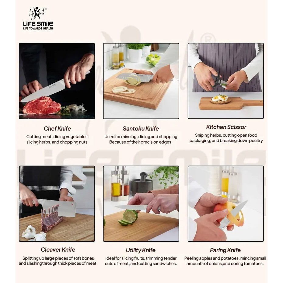 سرویس چاقو لایف اسمایل کد 11 دارای 1 عدد ساطور، 1 عدد چاقو سرآشپز، 1 عدد چاقو مخصوص برش و خرد کردن، 2 عدد چاقو جهت پوست کندن و برش میوه و صیفی جات و گوشت، 1 عدد قیچی آشپزی و 1 عدد استند چوبی می باشد.