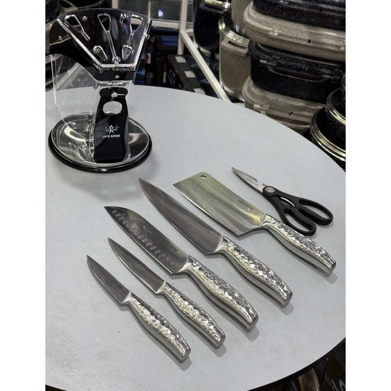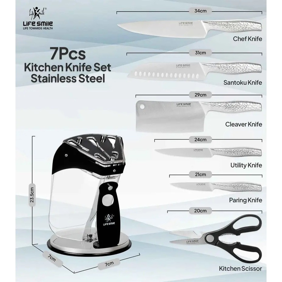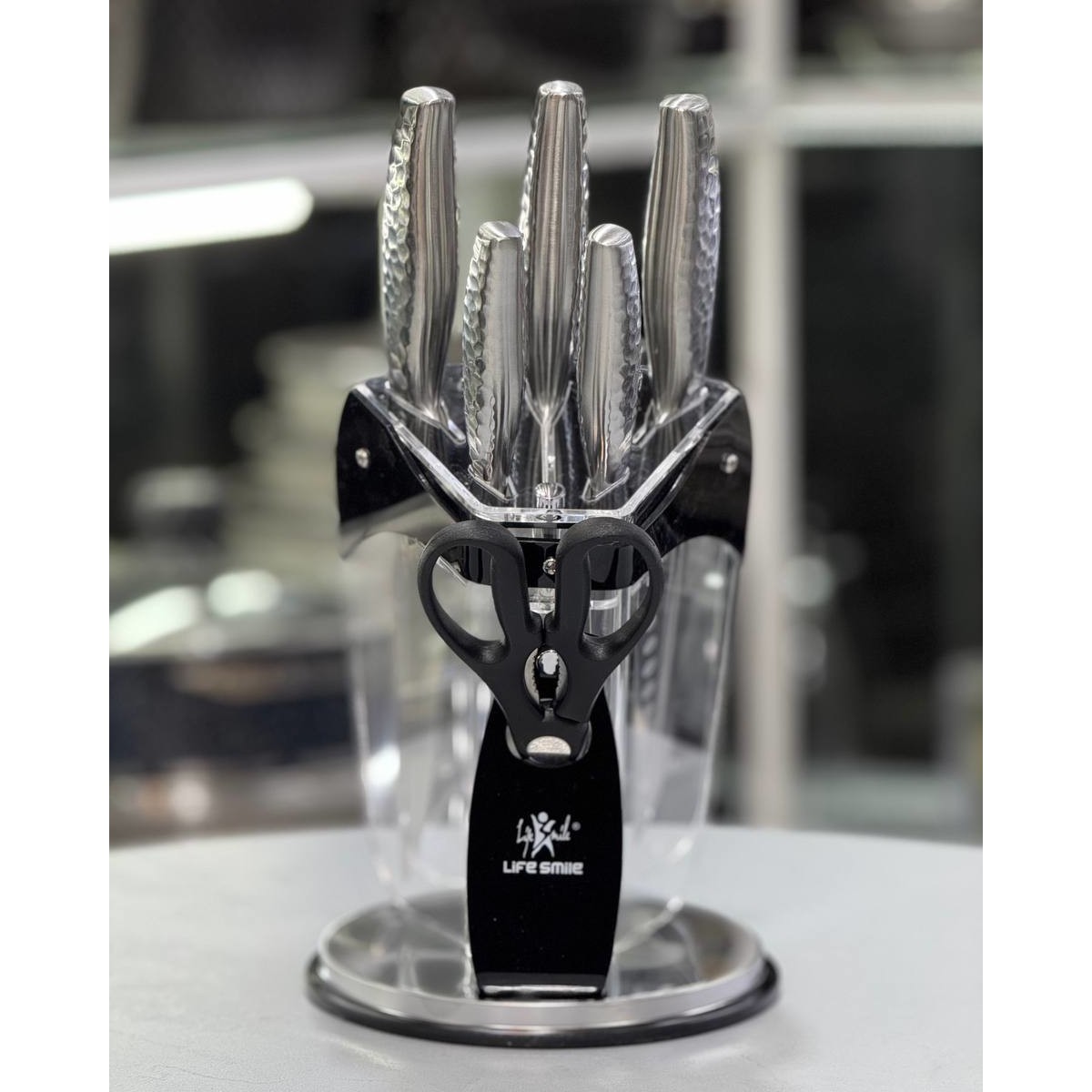 سرویس چاقو آشپزخانه لایف اسمایل مدل NSEL 11 هفت پارچه کالایی بسیار زیبا و کاربردی برای آشپزخانه منازل و محل کار می باشد. این سرویس چاقو از استیل ضد زنگ با کربن بالا ساخته شده که علاوه بر مقاومت بالا و لبه های تیزو دقیق، بسیار خوش دست و ارگونومیک ساخته شده که با توجه به وزن و ساحتار متعادلی که دارد دست را حین کار اصلا خسته نمی کند. دسته سرویس چاقو لایف اسمایل از استیل بوده که دارای طرح و رنگ زیبا نیز می باشد. استند شفاف شیشه ای، با کیفیت و زیبای این سرویس متعلقات را در خود به خوبی جای داده و فضای بسیار کمی را نیز به خود اختصاص می دهد.