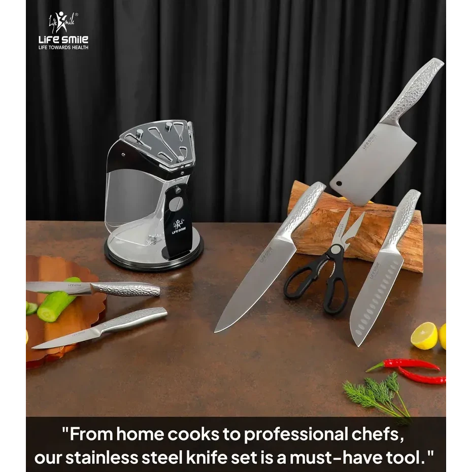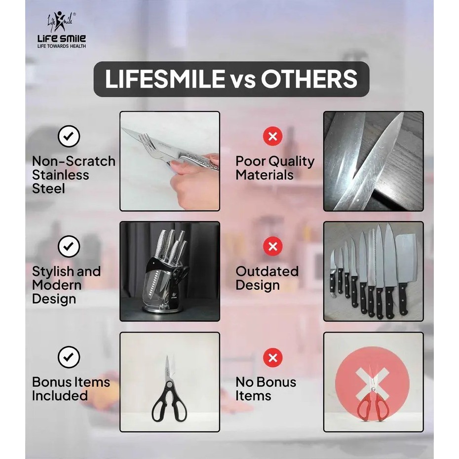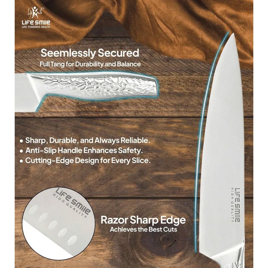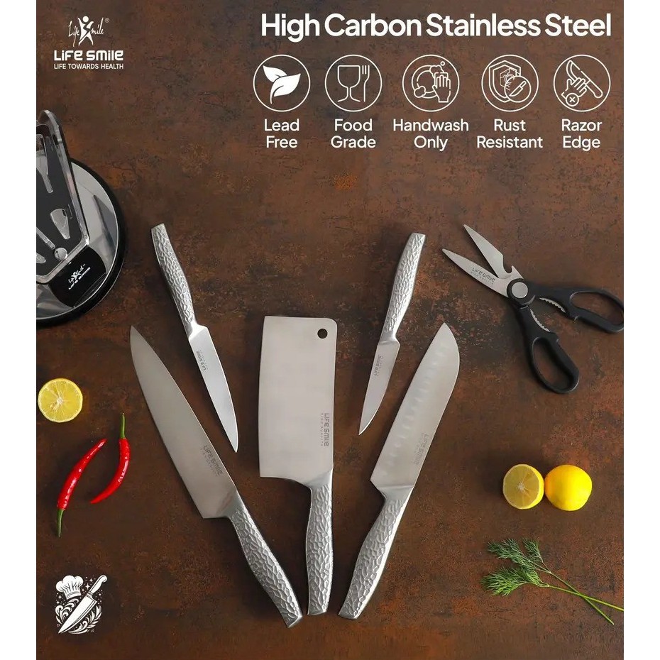 سرویس چاقو آشپزخانه لایف اسمایل مدل NSEL 11 هفت پارچه کالایی بسیار زیبا و کاربردی برای آشپزخانه منازل و محل کار می باشد. این سرویس چاقو از استیل ضد زنگ با کربن بالا ساخته شده که علاوه بر مقاومت بالا و لبه های تیزو دقیق، بسیار خوش دست و ارگونومیک ساخته شده که با توجه به وزن و ساحتار متعادلی که دارد دست را حین کار اصلا خسته نمی کند. دسته سرویس چاقو لایف اسمایل از استیل بوده که دارای طرح و رنگ زیبا نیز می باشد. استند شفاف شیشه ای، با کیفیت و زیبای این سرویس متعلقات را در خود به خوبی جای داده و فضای بسیار کمی را نیز به خود اختصاص می دهد.