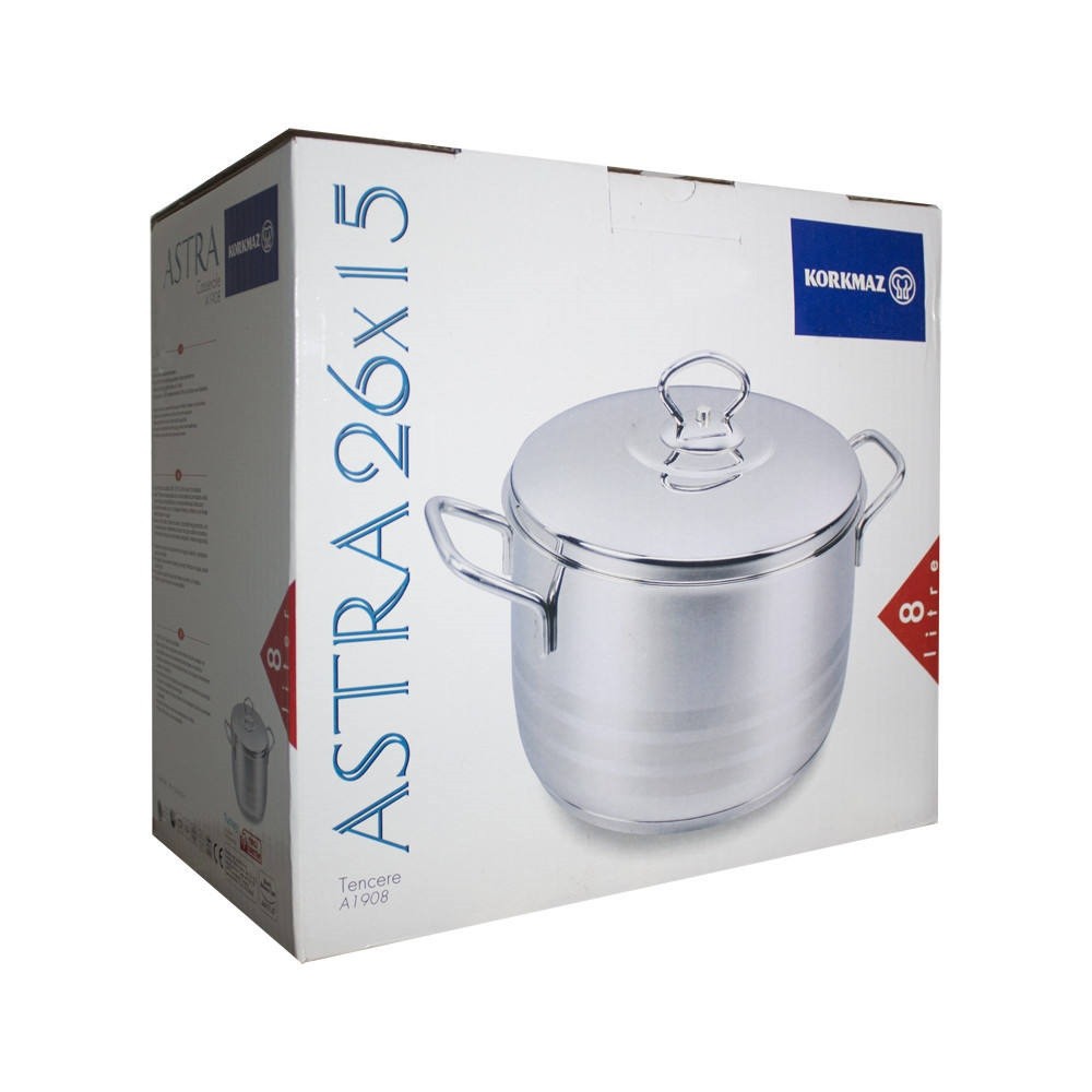 بدنه قابلمه از جنس استیل ضد زنگ 18/10 کروم نیکل زنگ ساخته شده است که استفاده از کروم و نیکل در این نوع استیل باعث مقاومت و زیبایی محصول خواهد شد. همچنین جنس دستگیرهها و درب از استیل ضد زنگ است. سطوح بیرونی قابلمه کرکماز مدل Astra A1908 با دقت زیاد جلا داده شده که درخشندگی آن برای همیشه حفظ می شود. قابلمه کرکماز گنجایشی معادل 8 لیتر دارد و در ابعاد 15*26 طراحی شده است.
