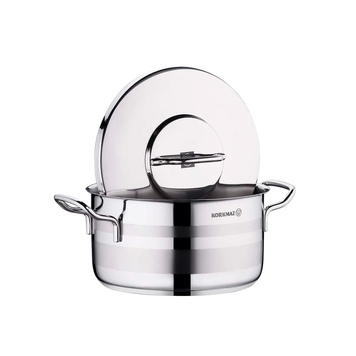 قابلمه استیل کرکماز مدل آسترا ASTRA2 A2026 محصولی زیبا از برند KORKMAZ کشور ترکیه می باشد. جنس این قابلمه از استیل ضد زنگ نیکل-کروم ساخته شده و دارای سطح بیرونی درخشان با مقاومت بالا در برابر خط و خراش است. همچنین دسته و دستگیره درب و جنس درب نیز از استیل ضد زنگ ساخته شده اند و طراحی درب آن مسطح بوده و راحت در ماشین ظرفشویی قرار می گیرد و برای نگهداری فضای کمی را اشغال می کند.