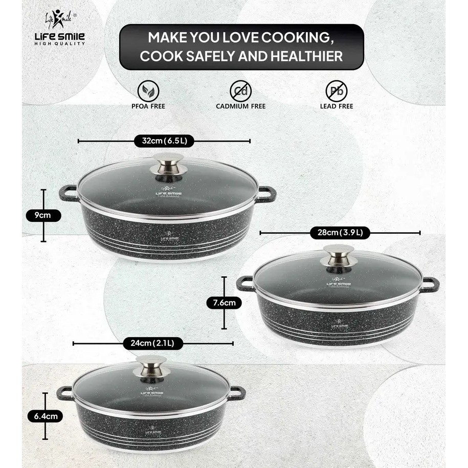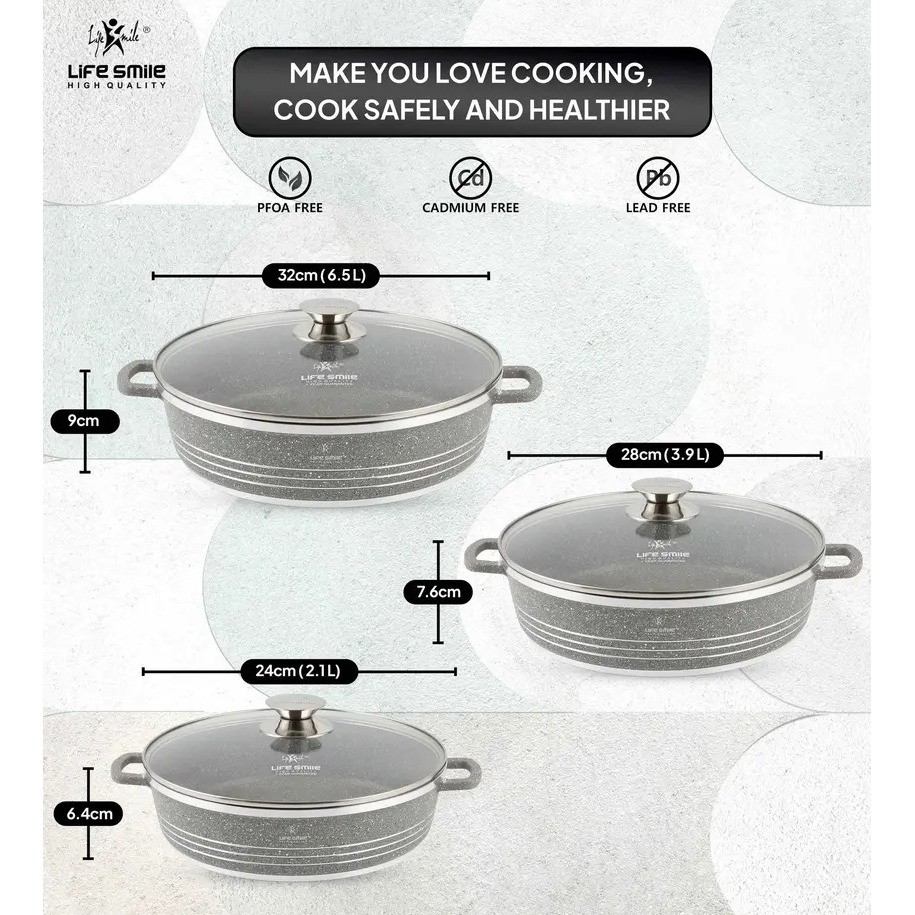 تابه گرانیتی لایف اسمایل مدل Lifep7ST SHR 32 کالایی با کیفیت و زیبا بوده که نیاز هر سرآشپز با سلیقه ای را در محیط کار و یا منزل براورده خواهد کرد. این تابه گرانیتی دو دسته دارای تابه هایی با سایز های 24*6.4، 28*7.6 و 32*9 سانتی متر با حجم های 6.4، 3.9 و 6.5 لیتر می باشد. این سرویس از آلمینیوم ریخته گری با پوشش با دوام و نچسب گرانیتی و همچنین دسته هایی همجنس با بدنه ساخته شده است. جنس درب از شیشه مقاوم با دستگیره های استیل می باشد. نچسب بودن کف تابه ها امکان استفاده حداقلی از روغن و آشپزی سالم تری را فراهم می کند.