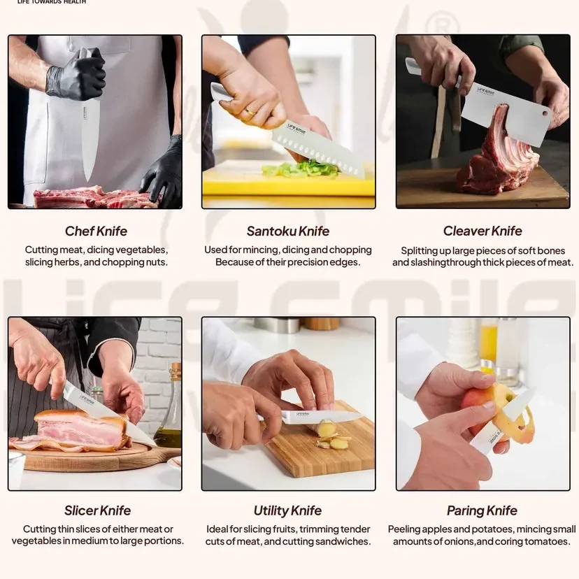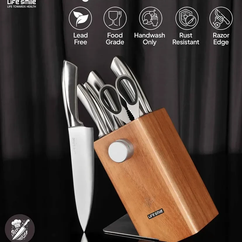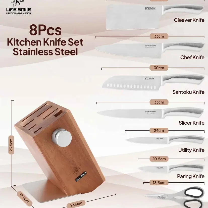سرویس چاقوی LIFE SMILE NSEL-14 شامل ساطور، قیچی، چاقوی سرآشپز، چاقوی مخصوص برش، 3 عدد چاقو برای پوست کندن و پاک کردن میوه و صیفی جات و برش گوشت و 1 عدد پایه نگهدارنده چوبی که در کنار بدنه آن 1 چاقو تیز کن قرار داده شده است.