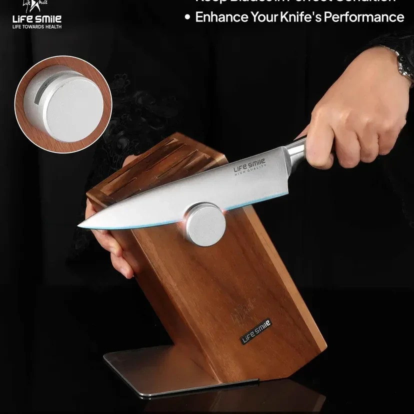 سرویس چاقو آشپزخانه لایف اسمایل مدل NSEL 14 محصولی جدید و کاربردی برای خانه و محل کار بوده که شامل 8 پارچه است. این سرویس از استیل ضد زنگ با کربن بالا ساخته شده که علاوه بر مقاومت بالا و لبه های تیزو دقیق، بسیار خوش دست و دارای طراحی ارگونومیک است که با توجه به وزن و ساختار متعادلی که دارد کار با آن دست را خسته نمی کند. دسته های این چاقوها از استیل ضد زنگ هستند. پایه چوبی با کیفیت، زیبا و ضد آب این سرویس متعلقات را به خوبی در خود جای داده و فضای بسیار کمی را اشغال می کند.
