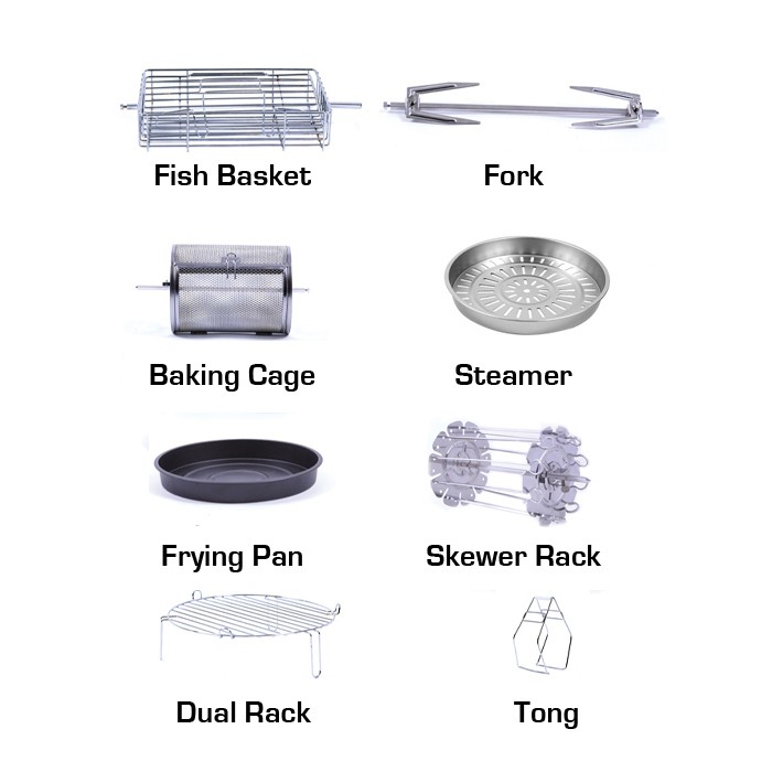 سرخ کن رژیمی عرشیا مدل AF116-1947 با ظرفیت 10 لیتر شامل اقلام همراه سبد ماهی، چنگال مخصوص و قطعه مخصوص نگهداری سیخ کباب، سیخ جوجه گردان، سینی بخارپز، سبد مخصوص سرخ کردن مواد غذایی، تابه، توری و سبد مخصوص سرخ کردن مواد غذایی است که به راحتی جدا می شوند و قابل شستشو می باشند.