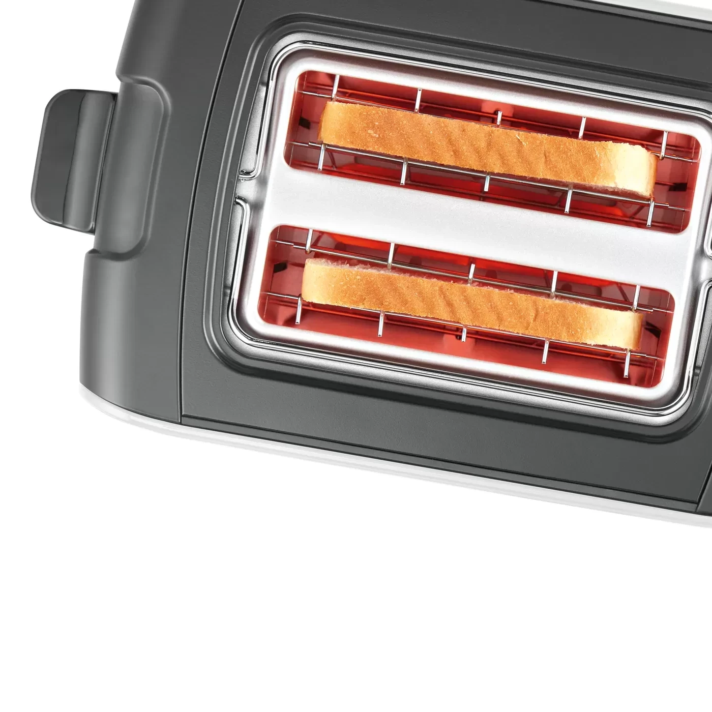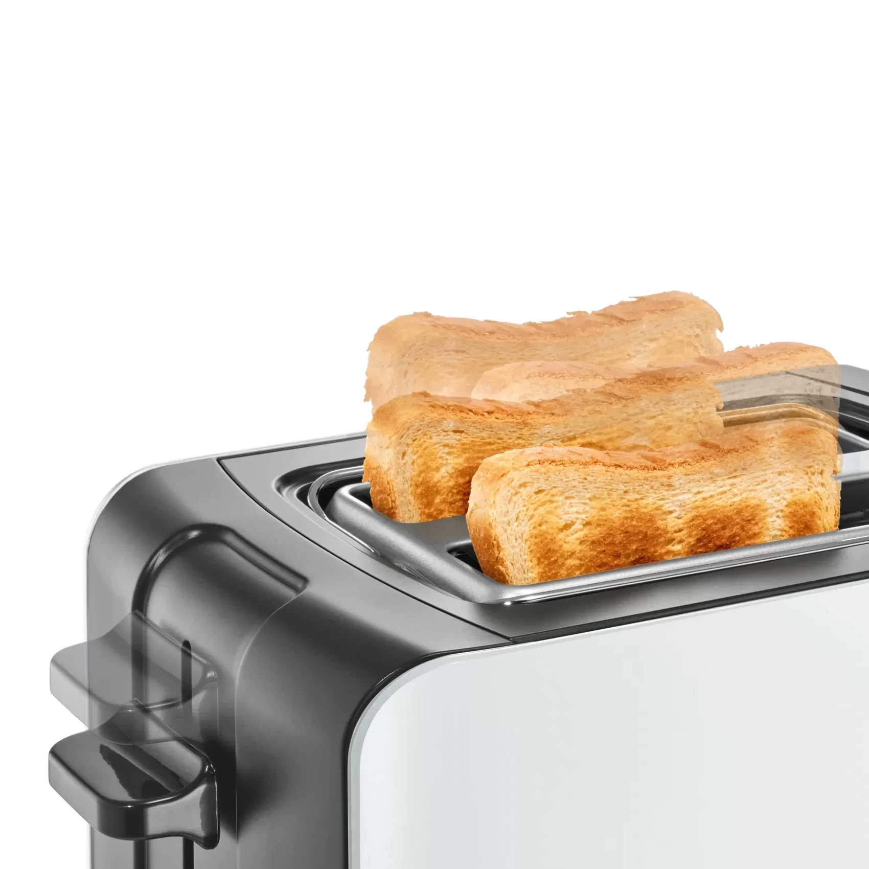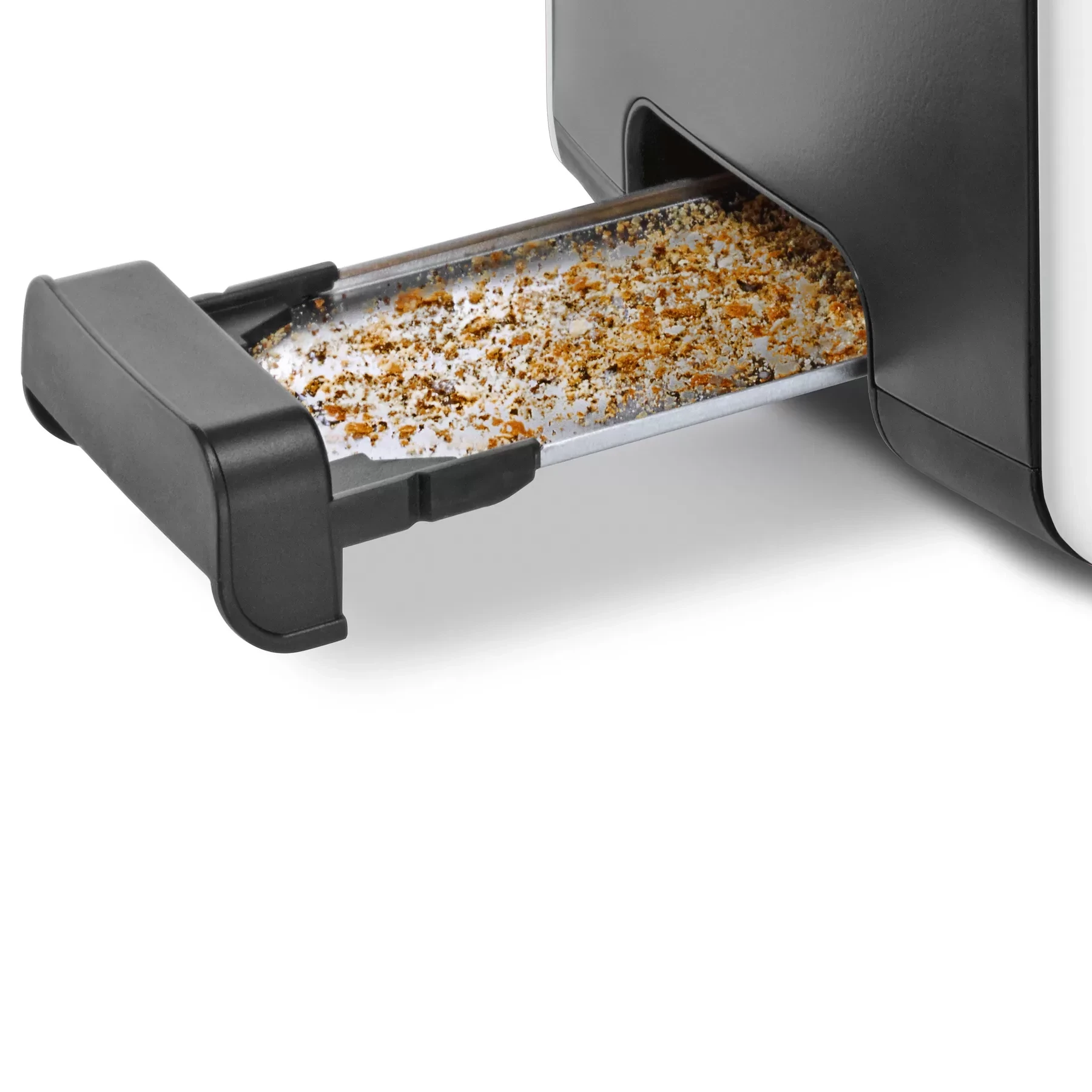 توستر BOSCH TAT6A111 توانایی تست دو برش نان را دارد. بالابر کشویی که در بغل دستگاه تعبیه شده است نان تست شده را به خوبی بالا آورده و حتی نان بسیار کوچک را میتوان به خوبی برداشت. اگر زمانی که نان در داخل دهانه گیر کند دستگاه به صورت اتوماتیک خاموش میشود. در قسمت زیر توستر، سینی کشویی جهت جمعآوری خرده نان وجود دارد و سطح کار شما تمیز خواهد ماند. سینی را میتوان را به راحتی بیرون کشید و آن را تمیز کرد. کابل برق دستگاه را بعد از پایان کار میتوان خیلی سریع جمع کرد و در محل مورد نظر جمع کنید.