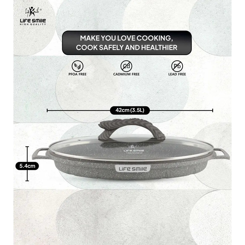 تابه ماهی گرانیتی لایف اسمایل مدل P7FI42S کالایی کاربردی و زیبا جهت پخت و پز و سرخ کردن مخصوصا ماهی تا اندازه های بزرگ می باشد. این تابه ماهی دودسته گرانیتی با سایز 42 و ارتفاع 5.4 سانتی متر و حجم 3.5 لیتر بسیار زیبا، خوش دست و ارگونومیک ساخته شده و با دسته هایی یکپارچه و هم جنس بدنه به راحتی و ایمن قابل جابجایی می باشد. جنس ماهی تابه گرانیتی لایف اسمایل از آلمینیوم ریخته گری با روکش مقاوم و نچسب گرانیت ساخته شده که توزیع یکنواخت دما را در اسرع وقت فراهم خواهد کرد. پوشش محکم و با دوام گرانیت تابه ماهی لایف اسمایل نچسب بوده و به راحتی نظافت می شود. همچنین سازگار با محیط زیست بوده و عاری از سرب و کادیوم می باشد و در حین پخت و پز گاز های مضر PFOA و سایر مواد شیمیایی متصاعد نخواهد شد و می توانید از سلامت آشپزی اطمینان حاصل کنید.