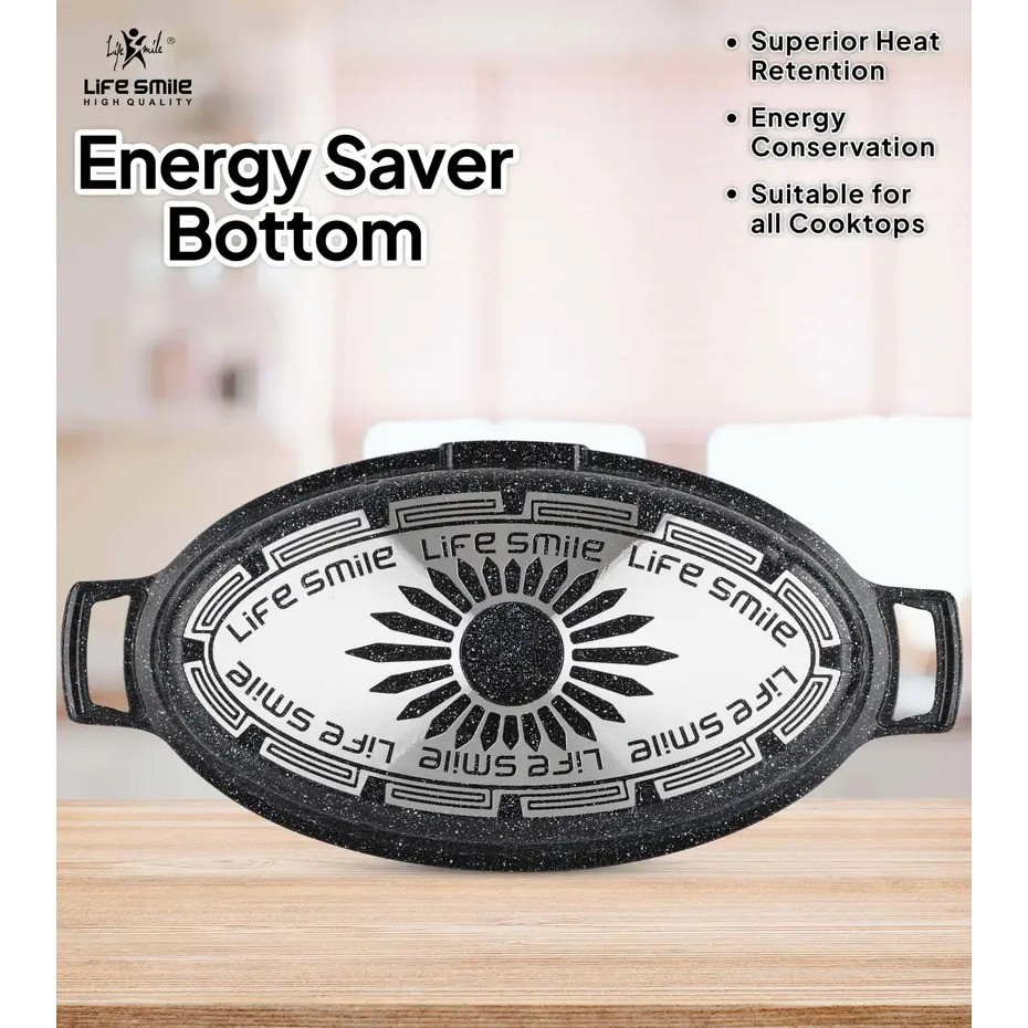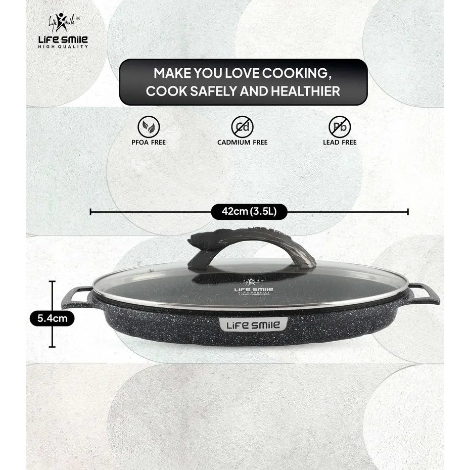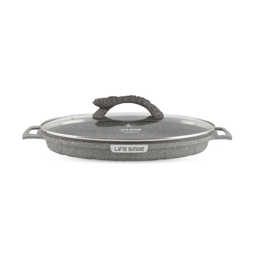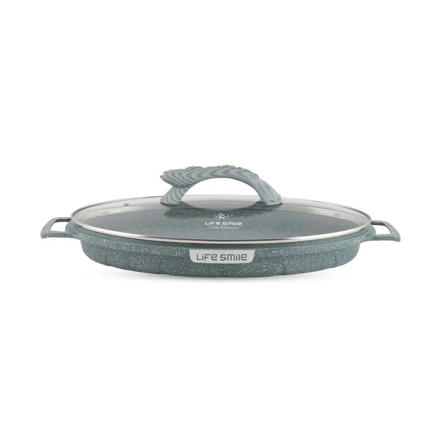 تابه ماهی گرانیتی لایف اسمایل P7FI42S دارای درب شیشه ای با دسته باکالیت مقاوم در برابر دما می باشد. کناره درب از استیل بوده و منفذ خروج بخار مانع از سر رفتن غذا می شود. این تابه ماهی لایف اسمایل را می توان بر روی انواع اجاق ها از جمله گازی، برقی، سرامیکی و هالوژنی استفاده کرد و همچنین قابلیت استفاده از آن داخل مایکروویو وجود دارد.