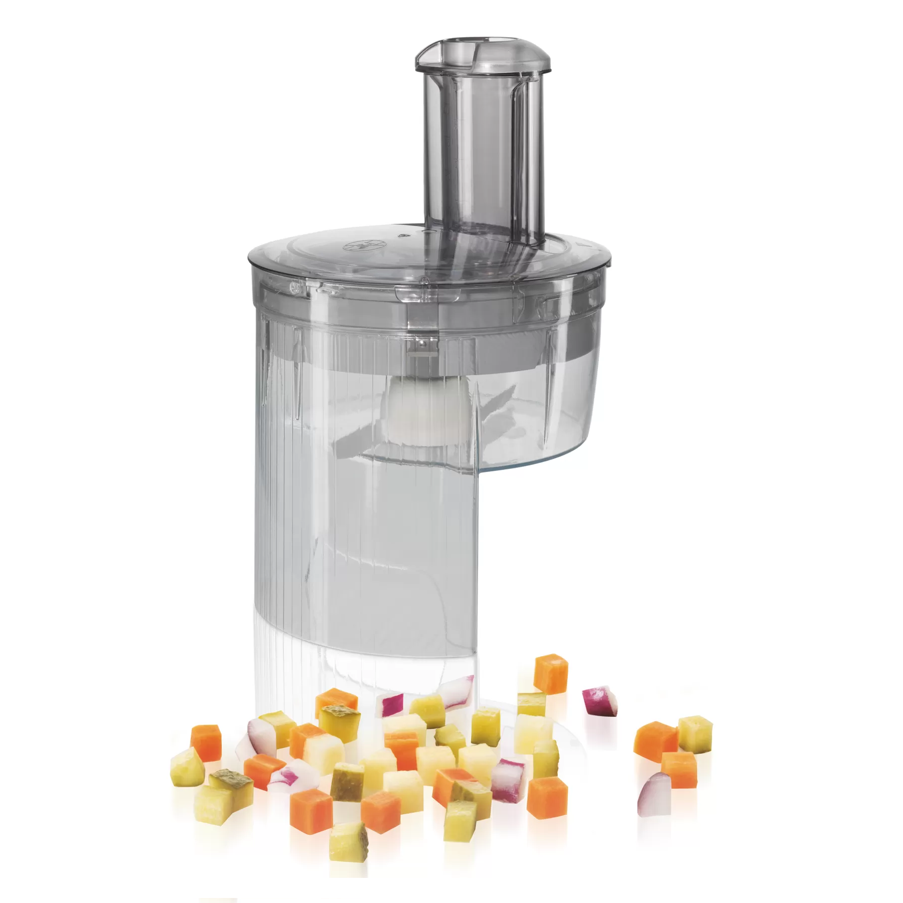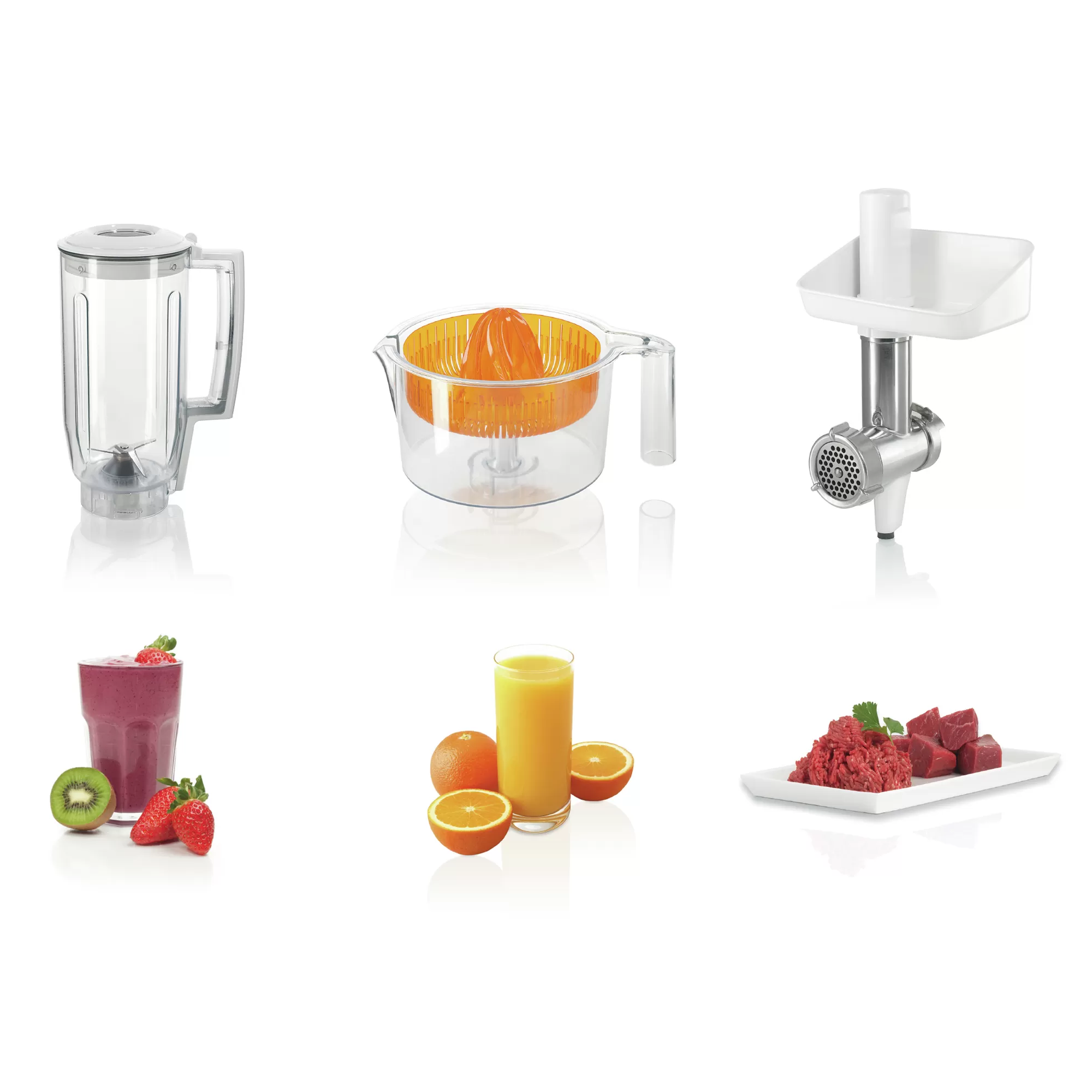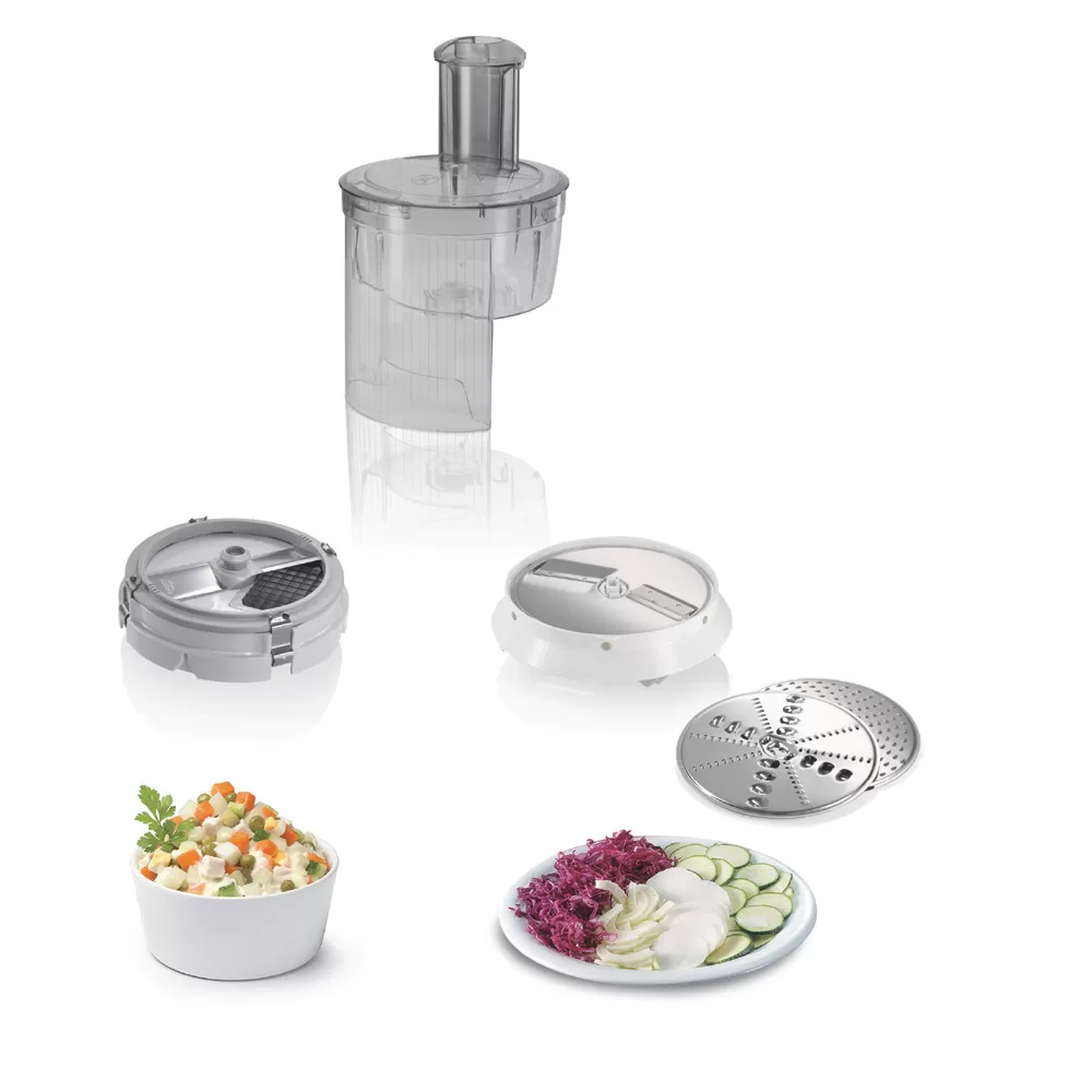 برای آماده سازی مواد اولیه انواع سالاد و چیپس و هر ماده ای که برای تهیه نیاز به خرد کردن داشته باشد می توانید از مخزن غذاساز ماشین آشپزخانه بوش مدل 54251 استفاده نمایید. ظرف این غذاساز با گنجایشی بالا مناسب برای خرد کردن هر نوع ماده غذایی ساخته شده است. سه عدد دیسک استیل به همراه این دستگاه وجود دارد که برای رنده ریز، درشت و چیپس کن می باشند. قابلیت آب مرکبات گیری هم به این دستگاه اضافه شده است به خصوص در فصل سرما می توانید از نوشیدن یک لیوان آب مرکبات تازه لذت ببرید.