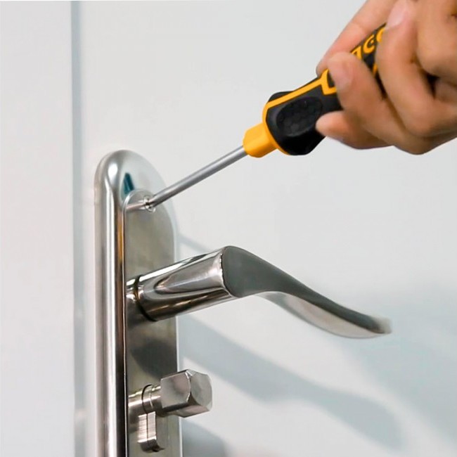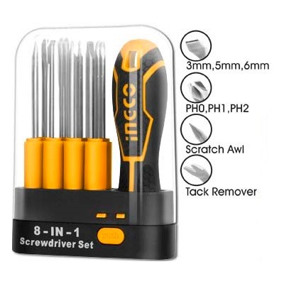 ست 9 عدد پیچ گوشتی اینکو مدل AKISD0901 یک ابزار مناسب با کیفیت عالی و مقاوم از برند معتبر iNGCO میباشد. این مجموعه از 8 عدد سری پیچ گوشتی و یک دسته تشکیل شده است. سریها نیز خود شامل سه عدد سری دو سو در سایزهای 3، 5 و 6 ، سه عدد چهار سو در سایزهای PH0، PH1 و PH2، یک سری سوزنی با سایز 3 و یک عدد خارکش در اندازه 5 میباشند. جنس سریها از آلیاژ کروم-وانادیوم با خاصیت مگنتی تولید شده و همگی دارای طول 65 میلیمتر هستند.