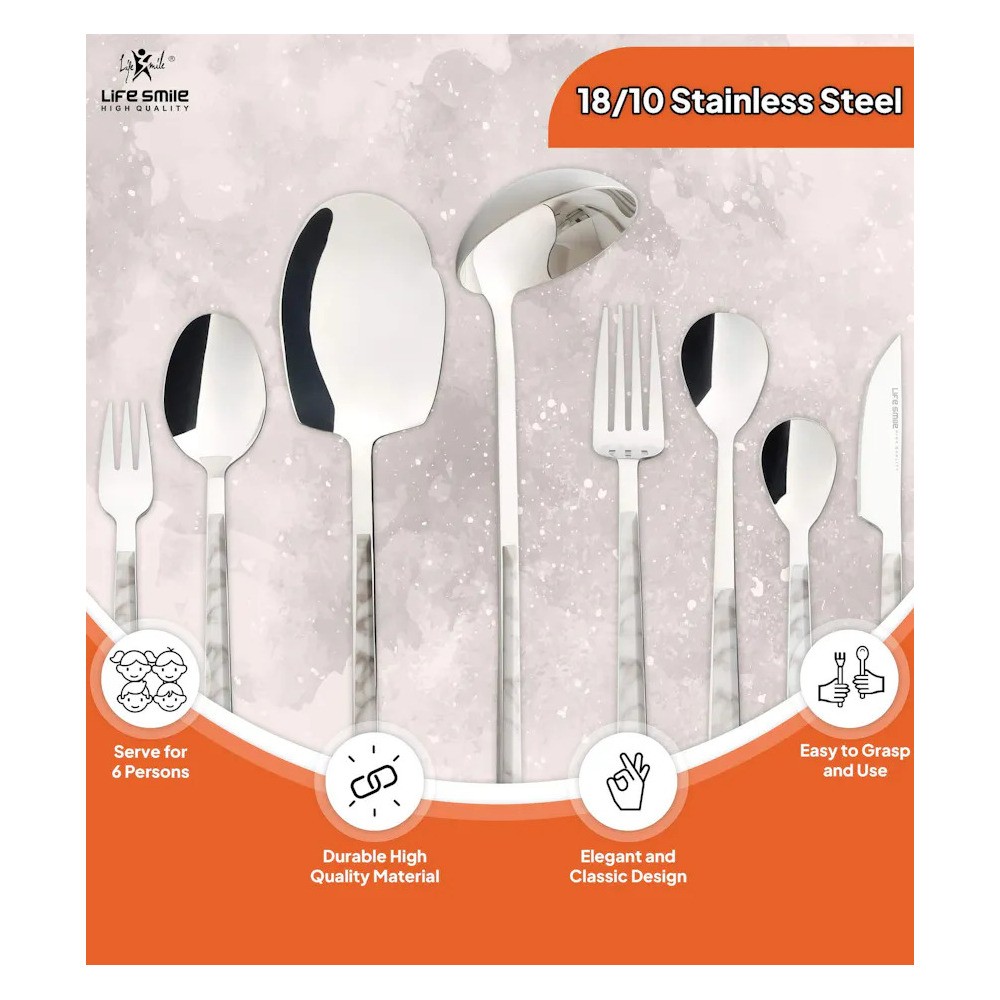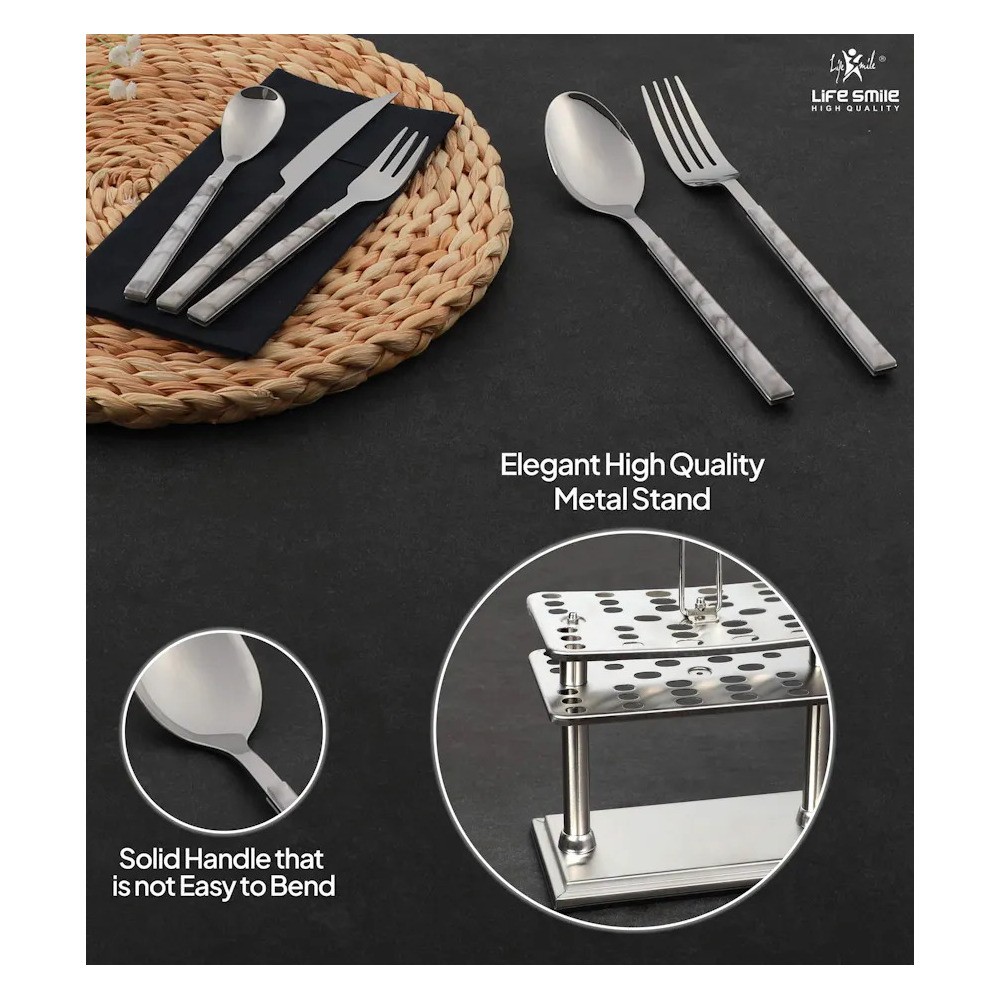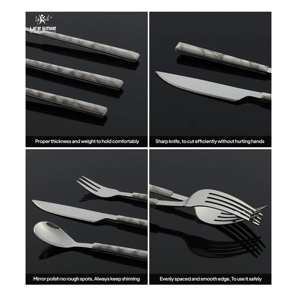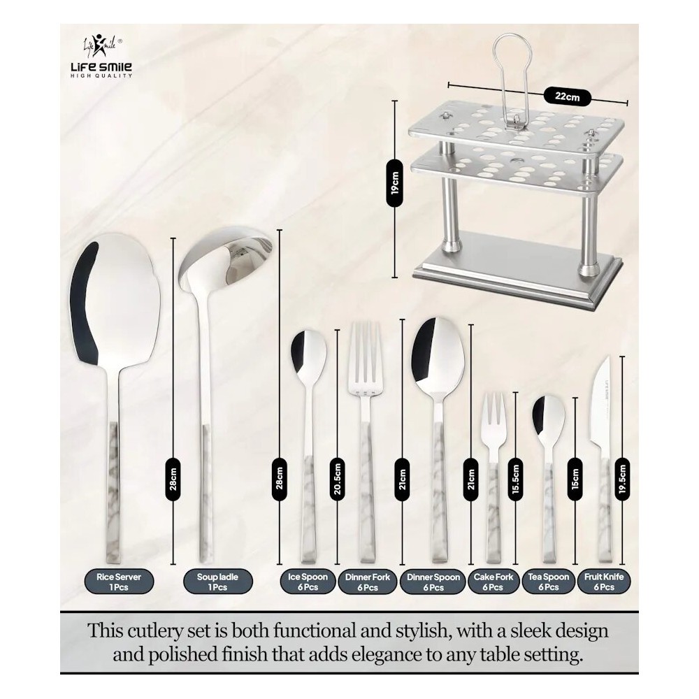 سرویس کارد و قاشق چنگال لایف اسمایل مدل Cut 38P 5 محصولی زیبا و کاربردی از برند Lifesmile بوده که از استیل ضدزنگ 18/10 نیکل کروم ساخته شده که با ظاهری براق، درخشنده و یکدست و دسته هایی از جنس مرمر مشکی مناسب برای استفاده در خانه، محل کار و کافه ها می باشد. این سرویس بر روی یک استند فلزی مربعی شکل به حالت زیبا و منظمی قرار می گیرد. سرویس قاشق چنگال لایف اسمایل 38P مشکی دارای وزن مناسب و طراحی ارگونومیک بوده و در حین استفاده از خستگی دست جلوگیری می کند. این سرویس شامل 6 عدد قاشق غذا خوری، 6 عدد چنگال غذا خوری، 6 عدد کارد میوه خوری، 6 عدد چنگال کیک خوری، 6 عدد قاشق چای خوری، 6 عدد قاشق بستنی خوری، 1 عدد کفگیر و 1 عدد ملاقه می باشد.