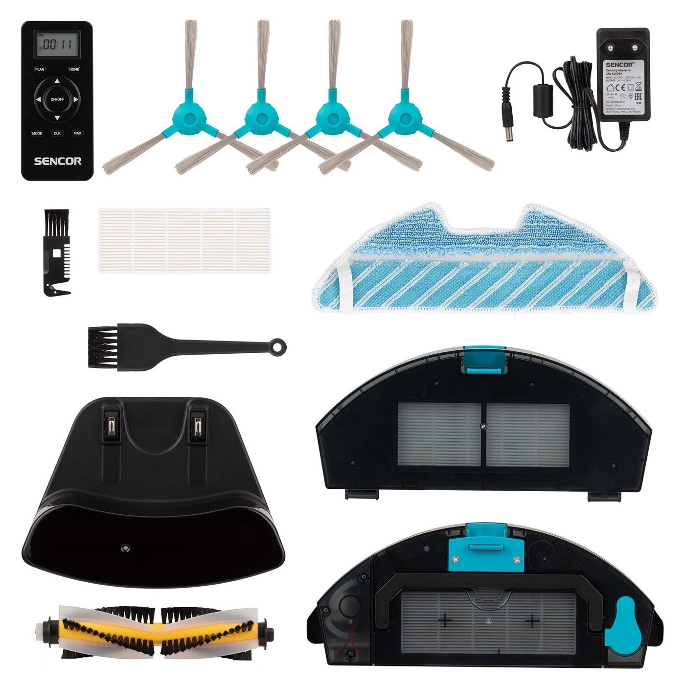 لوازم جانبی جارو برقی رباتیک سنکور شامل ریموت، شارژر، فیلتر هپا، مخزن آب، برس تمیزکاری، فرچه چرخان و حوله طی شور می باشد.