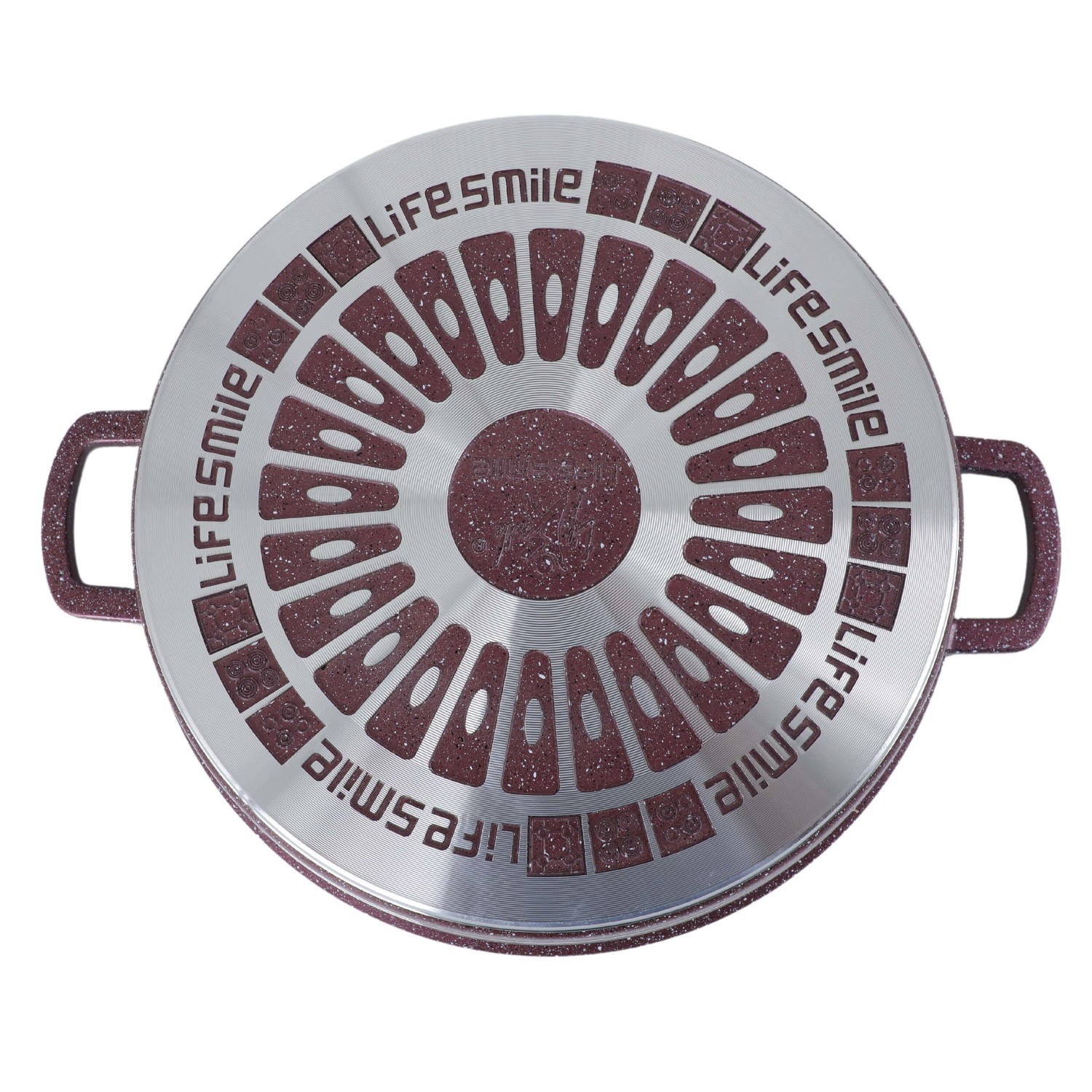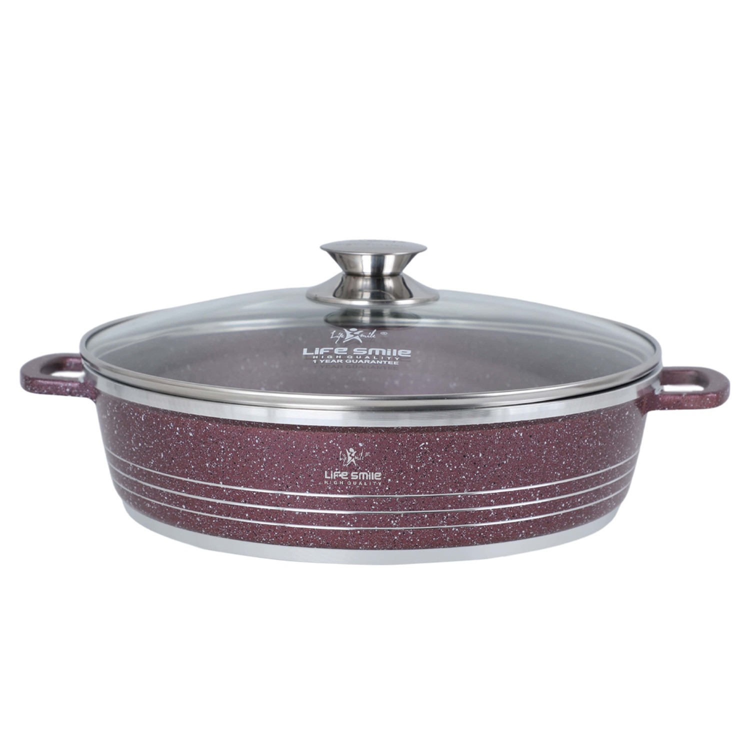 ماهی تابه LIFESMILE LIFEP7-SHR36 Granite Coated Shallow Pot دارای درب شیشه ای است که جنس دسته ی درب از جنس استیل ضد زنگ می باشد. این محصول لایف اسمایل را می توانید در مایکروویو استفاده کنید و به دلیل سطح نچسب آن این تابه راحتی قابل شستشو می باشد. این ماهی تابه در سه رنگ زرشکی، خاکستری و سبز تولید به بازار موجود عرضه شده است.