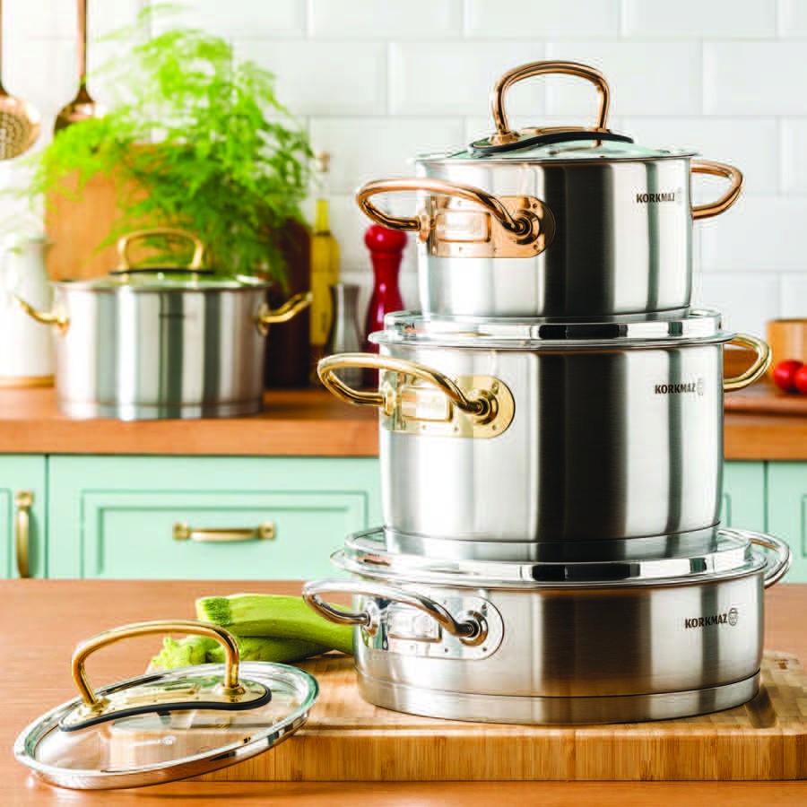 سرویس قابلمه استیل کرکماز مدل پرولاین A1148 یکی از سرویسهای بسیار زیبا و شکیل برند کرکماز میباشد. دستگیرههای این سرویس از استیل ضد زنگ ساخته شده و به رنگ طلایی میباشد. برای ساخت قابلمهها نیز از استیل ضد زنگ 10/18 (Cr-Ni 18/10 stainless steel) کروم و نیکل استفاده شده است. این استیل حاوی 18 درصد کروم و 10 درصد نیکل میباشد که باعث مقاومت و ظاهر براق قابلمهها خواهد شد.