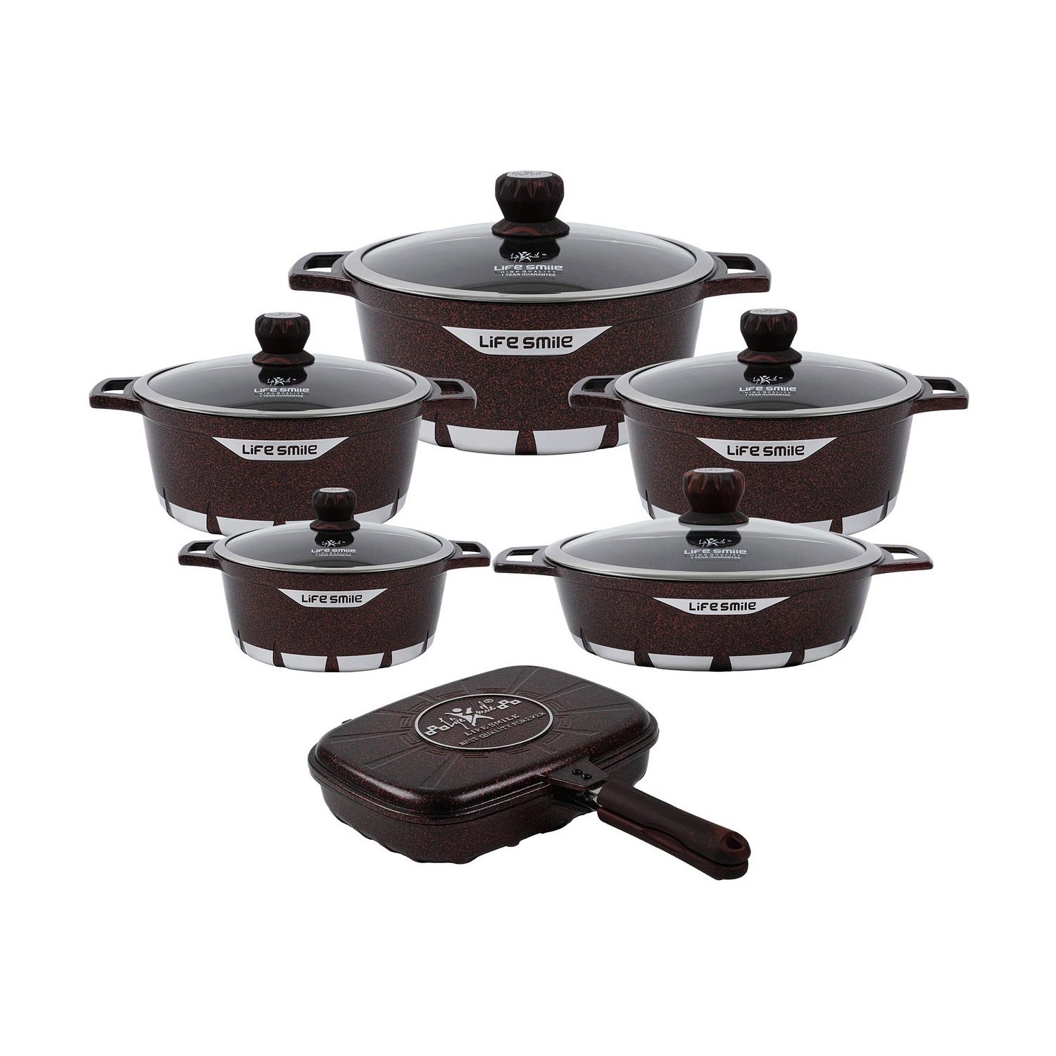 سرویس قابلمه 12 پارچه لایف اسمایل مدل FLCM12 از محصولات باکیفیت و زیبای برند معتبر Life Smile میباشد. این سرویس از چهار عدد قابلمه دربدار در سایزهای 20، 24، 28 و 32 سانتیمتر، یک عدد تابه دربدار در سایز 28 سانتیمتر و یک عدد تابه دو طرفه در سایز 32 سانتیمتر تشکیل شده است. ساختار بدنه سرویس از آلومینیوم ریختهگری شده با روکش گرانیتی بوده و دارای پایه القایی میباشد. استفاده از جنس آلومینیوم در ساخت این محصول موجب انتقال بهتر و توزیع یکنواخت حرارت در هنگام پخت غذا میشود. سرویس قابلمه لایف اسمایل هیچگونه گاز مضر PFOA را تولید نخواهد کرد و همچنین دارای سطوح نچسب بوده که غذا به آن نخواهد چسبید.