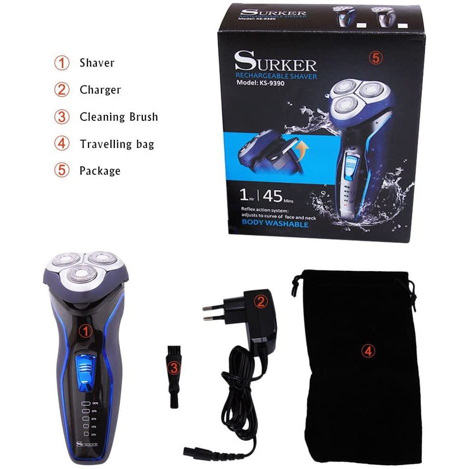 ماشین اصلاح Surker KS-9390 یک ریش تراش قابل شستشو و ضدآب ، با استفاده راحت می باشد و قابلیت اصلاح خشک و یا مرطوب دارد. تمام بدنه ی اسن ماشین ضد آب می باشد و شما حتی می توانید این ریش تراش را به همراه ژل اصلاح و یا در صورت مرطوب بودن صورتتان استفاده نمایید. همچنین به وسیله ی سیستم اصلاح روکش شناور که این دستگاه دارد ، منحنی های صورت شما را نیز به خوبی اصلاح کرده و چیزی را از قلم نمی اندازد. به عبارتی این سیستم تعبیه شده در هنگام عبور از منحنی های صورت شما ، اصلاح را مطابق با آن قسمت انجام می دهد و تیغه ها به صورتی قرار می گیرند که اصلاح بهتری صورت گیرد.