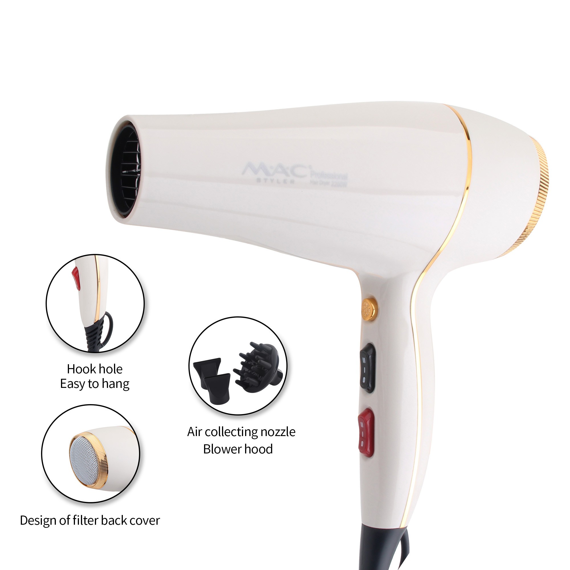 سری متمرکز کننده هوا برای افزایش سرعت حالت دهی مو و تمرکز پخش باد در یک نقطه استفاده می شود. در حالی که سری دیفیوزر سشوار مدل MC-6690 مک استایلر برای افرادی است که موهای فری دارند و برای خشک کردن موی خود نیاز به رسیدن باد سشوار به عمق مو می باشند. این محصول دارای سیمی بلند به طول 2.5 متر بوده و از یک حلقه برای آویزان شدن و اشغال فضای کمتر نیز برخودار است.
