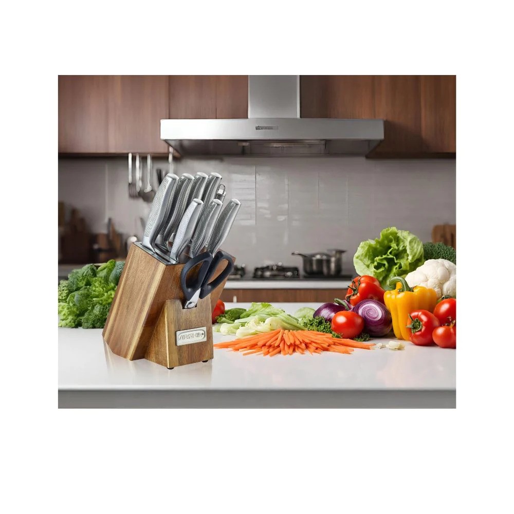 سرویس چاقو 3202 عرشیا در برابر لکه و زنگ زدگی مقاومت بالایی داشته و دارای طول عمر فراوان می باشد. لبه های سرویس چاقو استیل عرشیا با دقت فراوان صیقل خورده و تیز شده و ساختار آن به گونه ای بوده که به راحتی قابل بازیابی و تیز شدن مجدد است. تمامی ابزار و اقلام را می توانید بر روی یک استند چوبی زیبا و مقاوم نگه دارید که علاوه بر سهولت در دسترسی به چاقوها، زیبایی خاصی را به آشپزخانه نیز می بخشد.