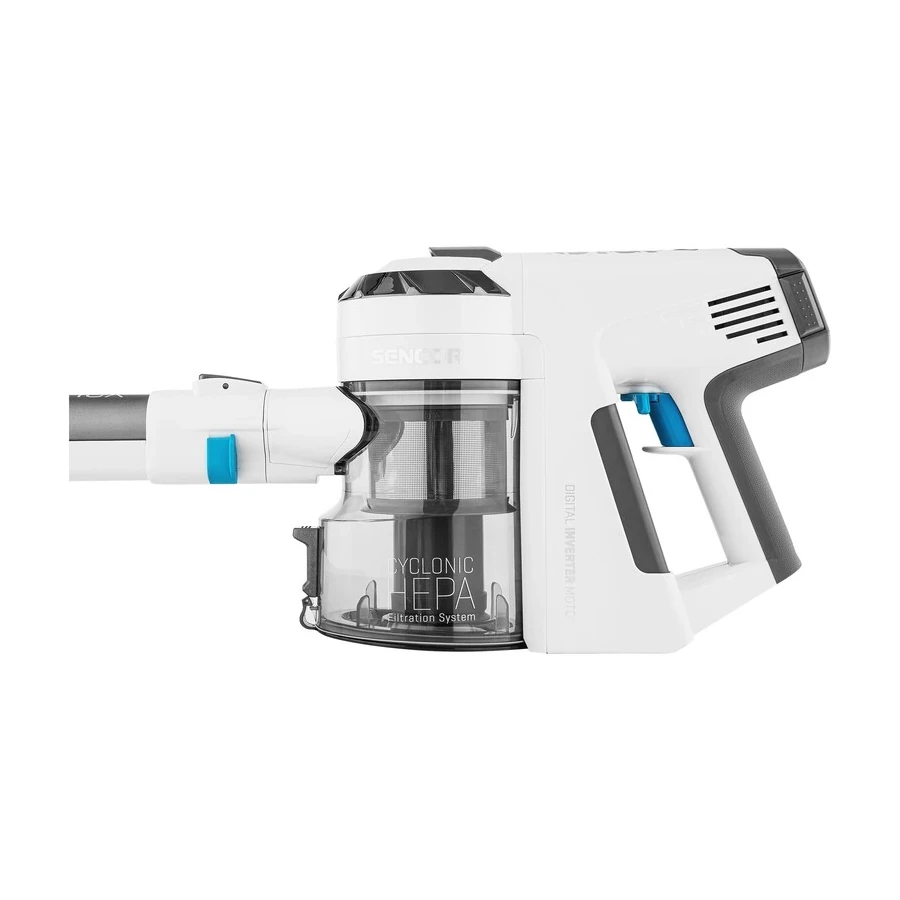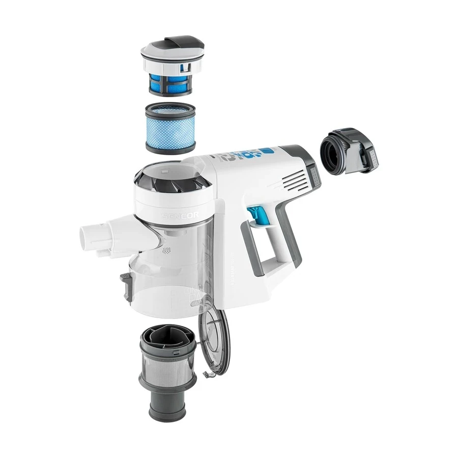 جارو شارژی سنکور دارای 2 عدد آکومولاتور، فیلتر بهداشتی HEPA با قابلیت شستشو است که کوچکترین گرد و غبار را می گیرد و بسیار مناسب کودکان و افراد دارای آلرژی است. چراغ های LED که در جلوی برس موتوری می باشد باعث می شود کف و یا نقاطی که نور کافی ندارد بهتر دیده شوند و کار نطافت به نحو بهتری انجام شود. پایه شارژ با نگهدارنده لوازم جانبی یکپارچه و شارژر باتری دوم.