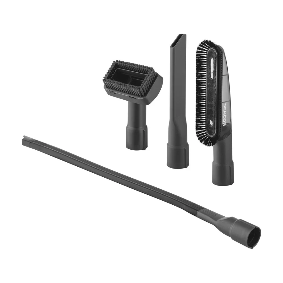 لوازم جانبی SENCOR SVC 0825WH شامل برس چرخان موتوری مینی که دارای چرخشی با شعاع 180 درجه است و بسیار سبک بوده و براحتی در اطراف وسایل خانه مانند مبلمان می چرخد و کار نطافت و کنترل آن را آسان می کند، مخصوصا برای افرادی که سگ و گربه در خانه نگهداری می کنند براحتی موهای آن ها را جمع آوری می کند، نازل شکافی FLEXI REACH که دارای انعطاف پذیری بالایی است که می تواند به نقاطی مانند پشت پنل های گرمایشی، زیر کابینت ها و یا زیر صندلی ماشین به راحتی دسترسی داشته باشید، برس چند زاویه ای، برس گرد و غبار نرم و قفسه کتاب، شیلنگ انعطاف پذیر، دارای انواع لوازم جانبی برای تمیز کردن تمامی نقاط خانه است.