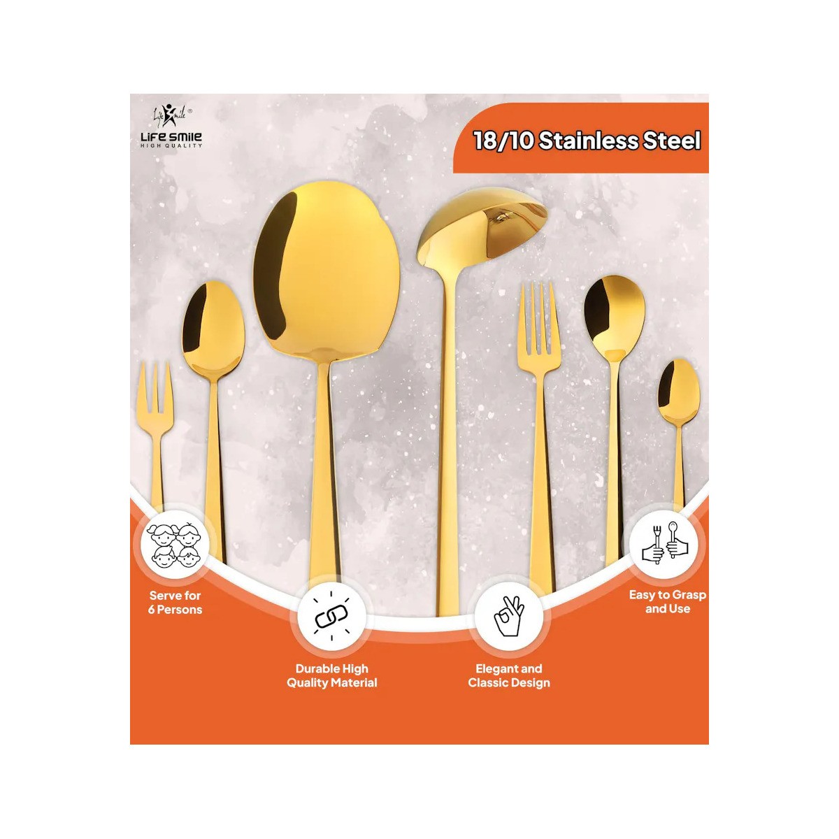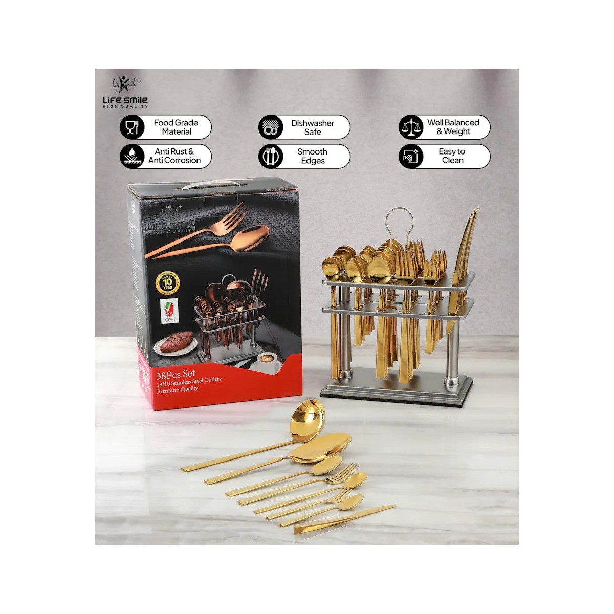 سرویس 38 پارچه کارد و چنگال لایف اسمایل شامل 6 عدد قاشق غذا خوری، 6 عدد چنگال غذا خوری، 6 عدد کارد میوه خوری، 6 عدد چنگال میوه خوری، 6 عدد قاشق چای خوری، 6 عدد قاشق بستنی خوری، 1 عدد کفگیر و 1 عدد ملاقه می باشد. این 38 پارچه بر روی استند زیبای فلزی با رنگ نقره ای با نظم خاصی قرار می گیرند.