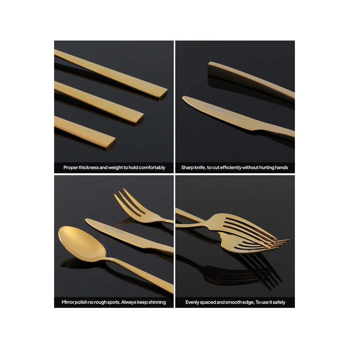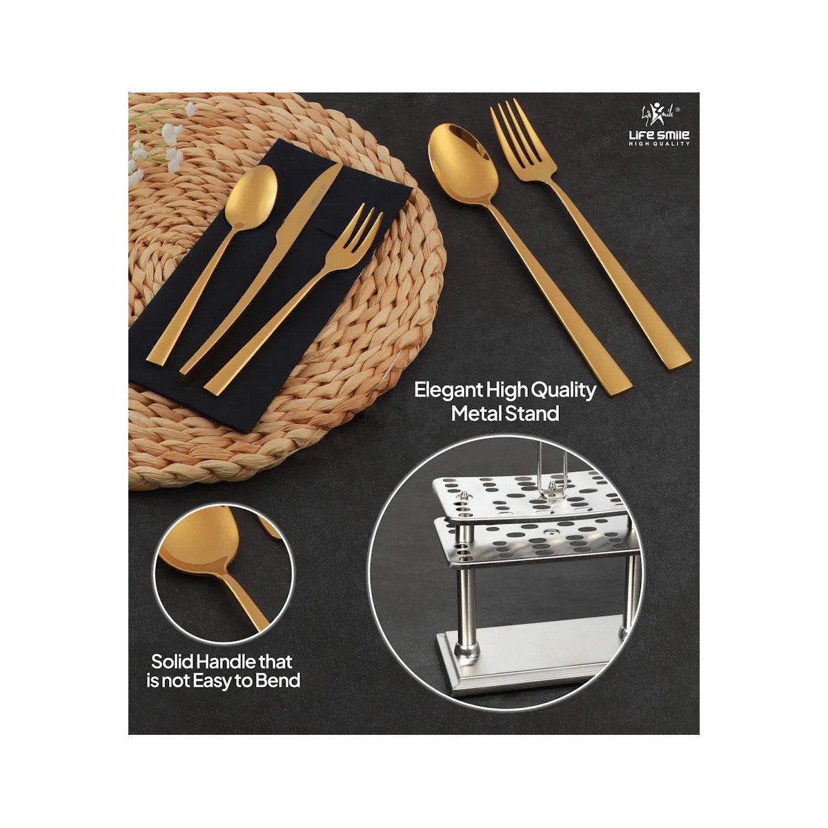 سرویس قاشق و کارد و چنگال لایف اسمایل مدل CUT 38 4 محصولی زیبا، کاربردی و با کیفیت با رنگ طلایی می باشد که با توجه به متعلقات و فضای جمع و جوری که دارد از آن می توان برای استفاده های روزمره و همچنین برای مهمانی های تا 6 نفر بهره برد و در استند مربوطه با نظم و زیبایی خاصی قرار می گیرند. جنس سرویس قاشق چنگال 38 پارچه لایف اسمایل از فولاد ضدزنگ 18/10 با کیفیت بالا بوده که درخشش و ظاهر خود را در طول زمان حفظ خواهد کرد.
