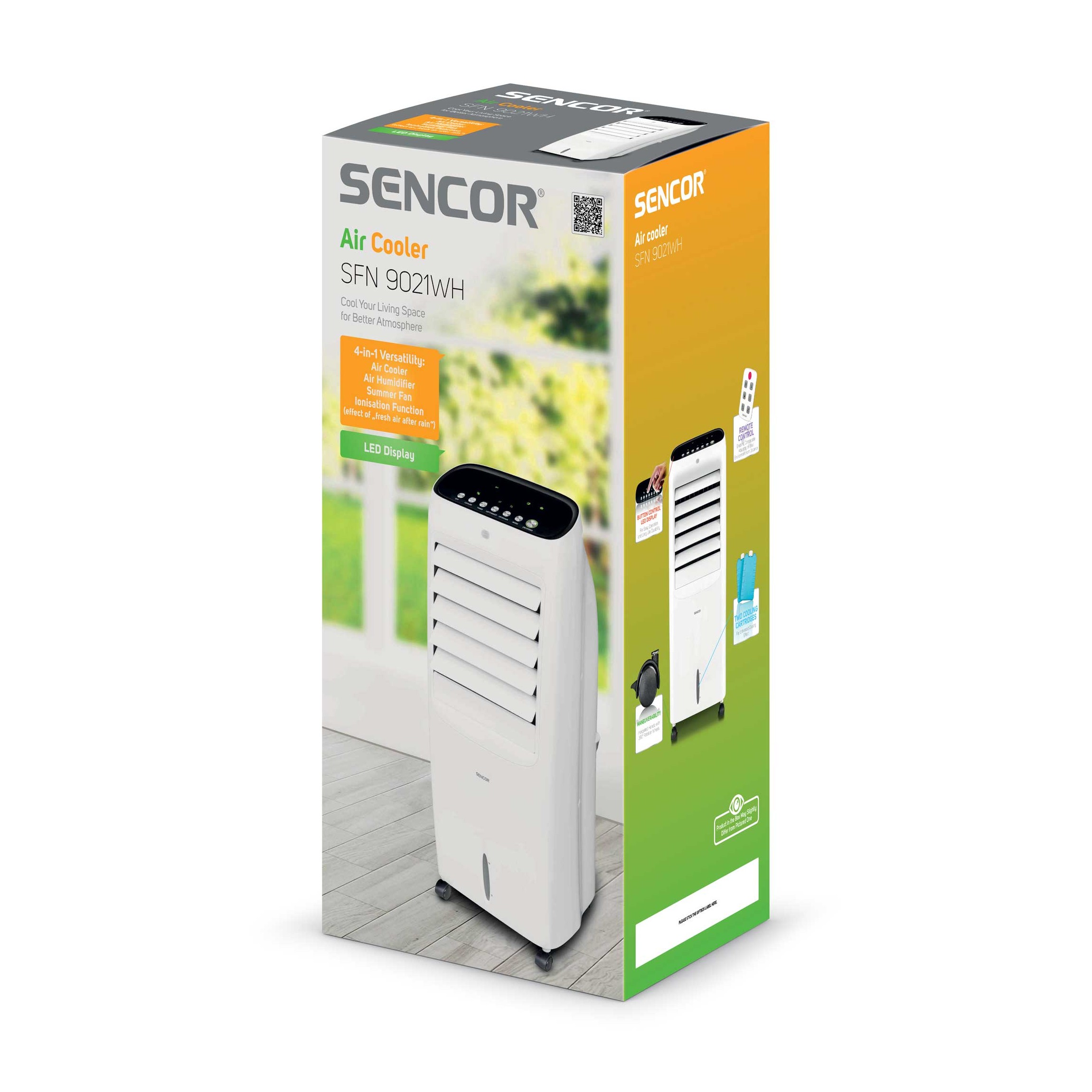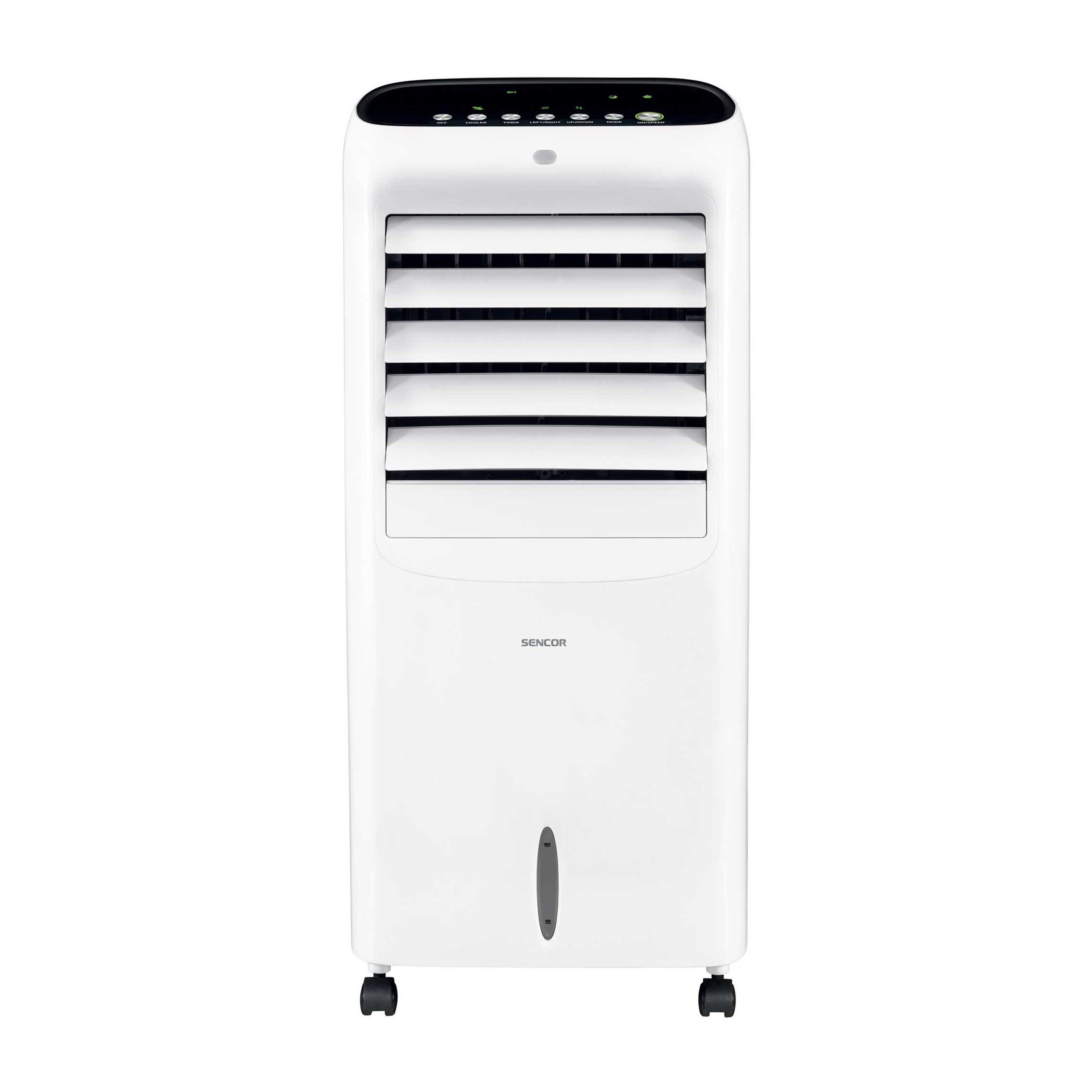 SENCOR AIR COOLER SFN9021 دارای 3 سرعت کم، متوسط و زیاد است که در هوای گرم تابستان هر سلیقه ای را راضی می کند. در جلوی پنکه دارای نمایشگر LED با چراغ نشانگر است که عملیات ها بر روی آن نشان داده شده است و گریل جلویی قابل تنظیم است برای اینکه هوا بصورت یکنواخت در محیط پخش شود و همچنین دارای فیلتر گرد و غبار برای داشتن هوایی تمیز و بدون آلاینده است. دارای مخزن آب 6 لیتری که قابلیت جابجایی دارد و می توانید آن را از دستگاه جدا کنید و از آب یا یخ برای داشتن هوایی خنک تر پر کنید و در جای خود قرار دهید و دسته یکپارچه دارد که جابجایی آن را آسان کرده است. پنکه آبی سنکور دارای نشانگر سطح آب است که در صورت خالی بودن خاموش خواهد شد.