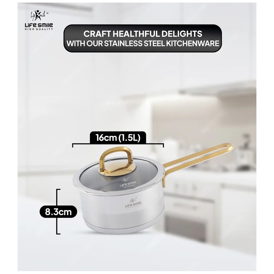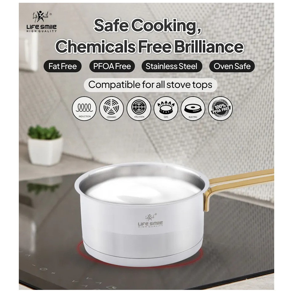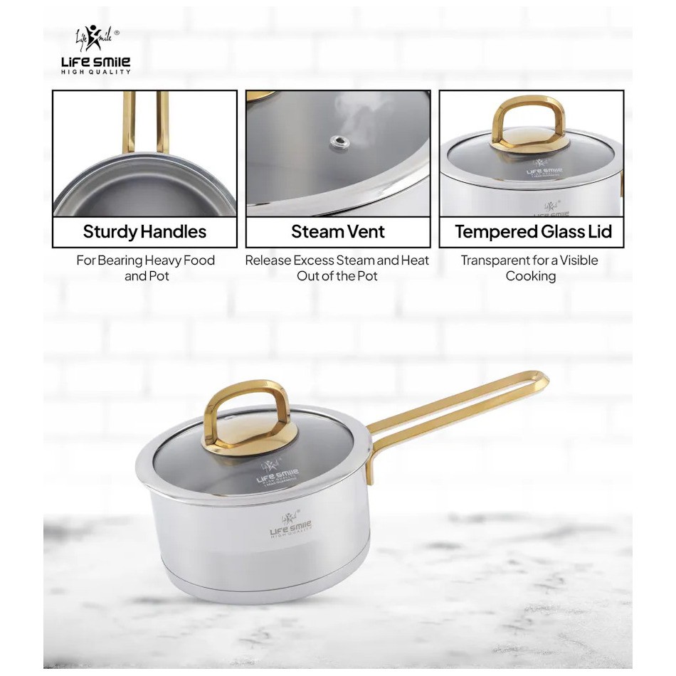 شیر جوش استیل لایف اسمایل مدل Lifep12 Sau16 از محصولات زیبا و کاربردی این برند بوده که با سایز 16*8.3 و ظرفیت 1.5 لیتر مقدار مناسبی از شیر، روغن و یا هر محصول دیگری را در هر بار استفاده آماده می کند. شیرداغ کن استیل لایف اسمایل از جنس استیل ضدزنگ آلیاژِ 18/10 نیکل کروم بوده که دسته بلند آن نیز هم جنس بدنه می باشد. این محصول دارای درب شیشه ای نشکن همراه با منفذ خروج بخار آب بوده که علاوه بر امکان مشاهده مواد غذایی حین آماده سازی از سر رفتن آن نیز جلوگیری می شود. دسته استیل شیرجوش محکم و به حالت ارگونومیک به آن پرچ شده و جابجایی آن با خیال راحت انجام می گیرد. کفه شیر جوش به صورت سه لایه کپسولی طراحی شده که این امر موجب انتقال گرمای یکنواخت و سریع می شود. کفه القایی این محصول از برند لایف اسمایل امکان استفاده از آن بر روی اجاق های القایی را فرهم می کند. هرچند که از این شیرجوش استیل می توان بر روی اجاق های الکتریکی، گازی، سرامیکی و هالوژنی نیز اسفاده کرد.