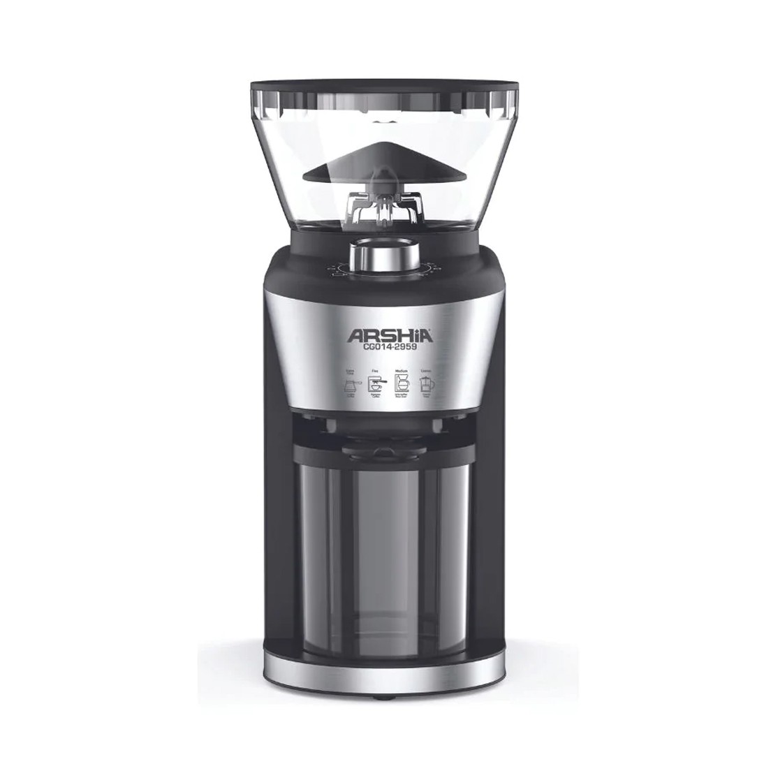 جنس بدنه Arshia CG014-2959 از استیل و پلاستیک بادوام ساخته شده و دارای وزن و حجم کم است و فضای زیادی را اشغال نمی کند. جنس قطعات آسیاب از استیل ضد زنگ ساخته شده از جمله تیغ های آن که بصورت مخروطی می باشد که دانه ها را یکنواخت پودر می کند و دارای محفظه مخروطی شکل در بالای دستگاه از جنس شیشه است که 130 گرم دانه قهوه را در خود جای می دهد و بوسیله قفل ایمنی که دارد در حین آسیاب کردن کاملا ثابت و ایمن است و محفظه پایین دستگاه که 250 گرم قهوه پودر شده را در خود جای می دهد.
