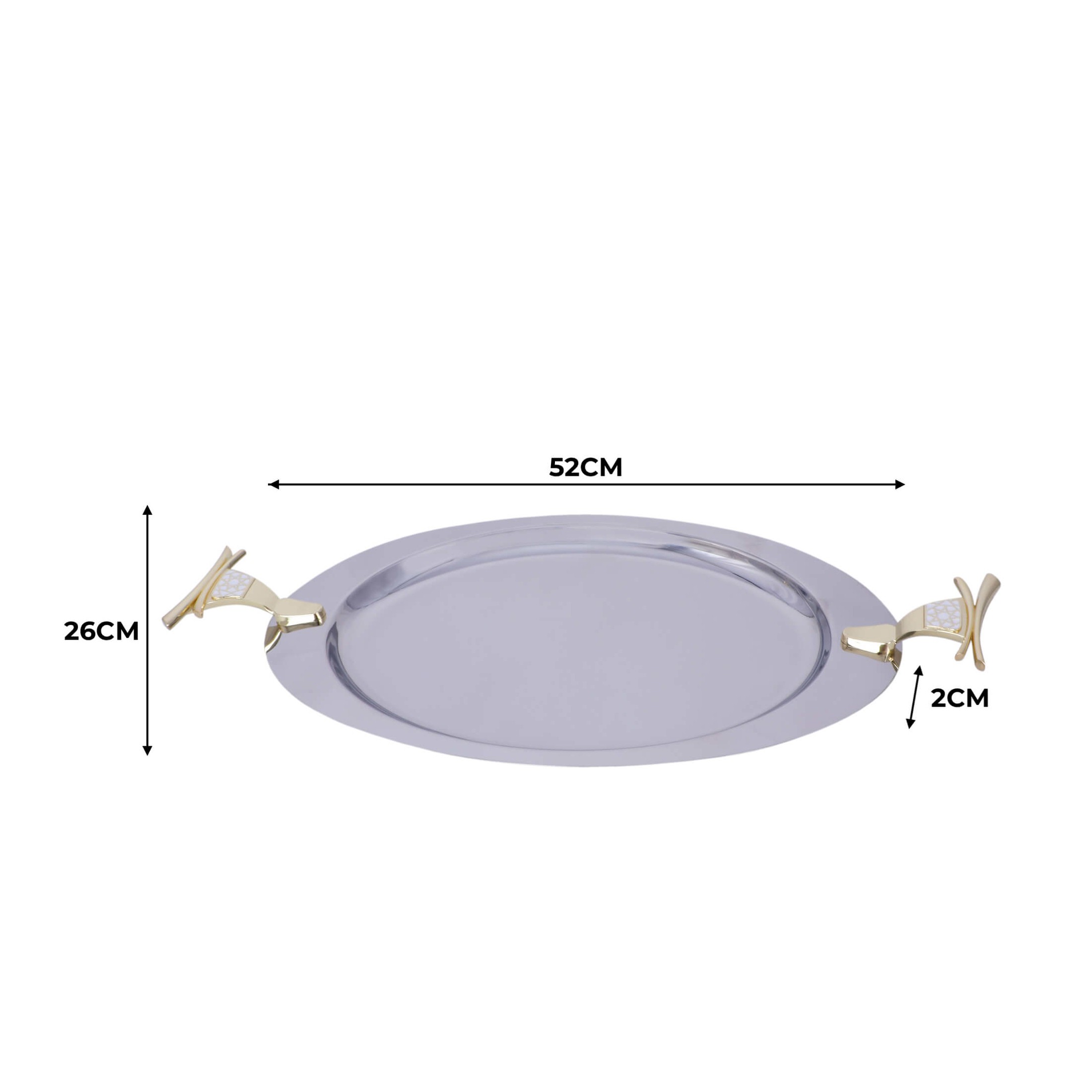 سینی تکی لایف اسمایل WARBF 11 یک محصول زیبا و دست ساز است که برای پذیرایی از مهمان های شما در دور همی ها و مجالس شما و همین طور استفاده در سلف سرویس رستوران ها بسیار مناسب است. طراحی منحصر به فردی که این محصول دارد با رنگ نقره ای و روکش آیینه ای به کار رفته در تولید این سینی بیضی شکل جلوه و درخشندگی فراوانی به آن داده است.