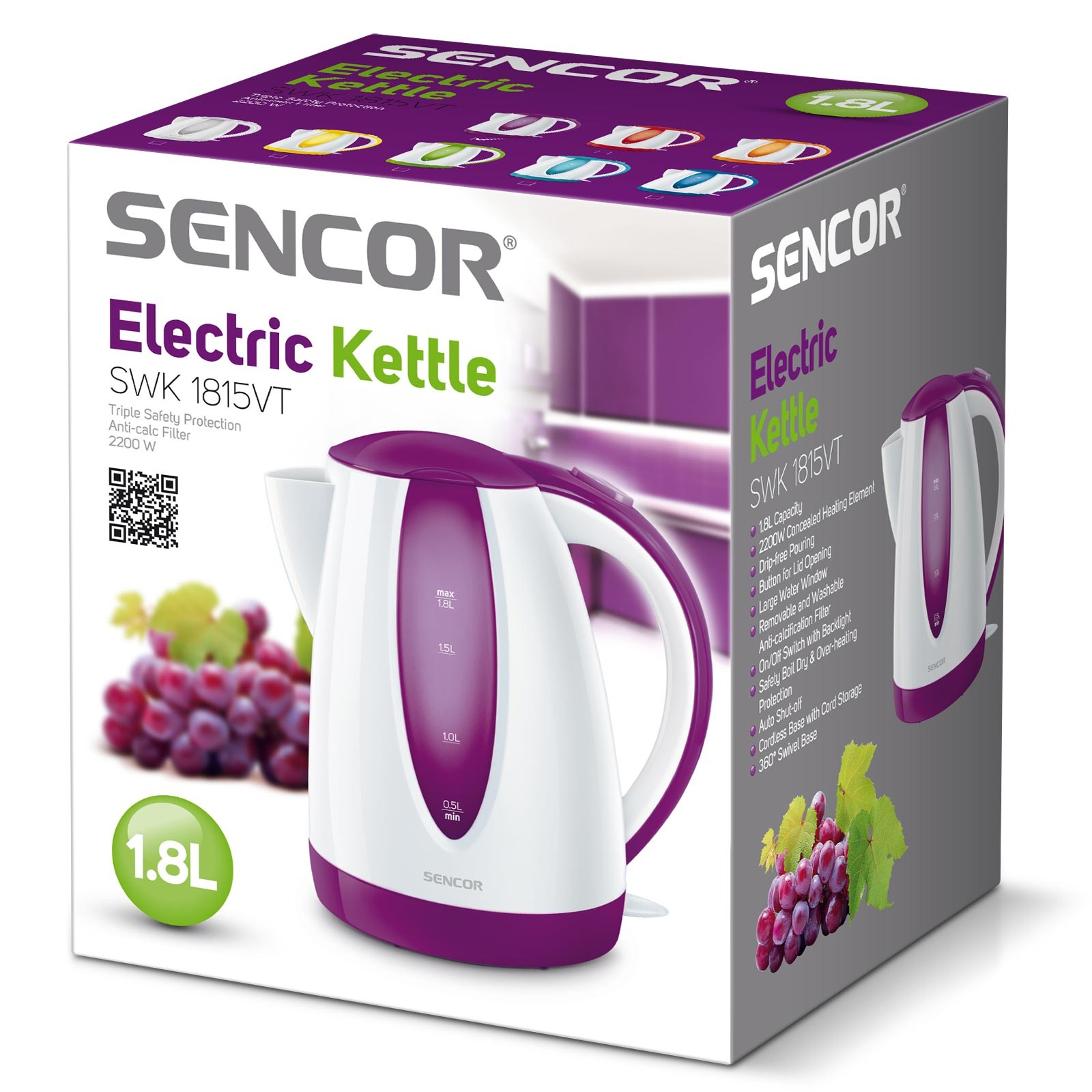 کتری برقی Sencor SWK 1815VT دارای یک پایه گرمایشی از جنس استیل ضد زنگ است و در داخل آن المنت حرارتی تعبیه گردیده است. کتری بدون سیم بوده و قابلیت چرخش 360 درجه را دارد. علاوه بر این در زیر پایه گرمایشی محل مخصوص جهت جمع آوری سیم دستگاه تعبیه گردیده است.