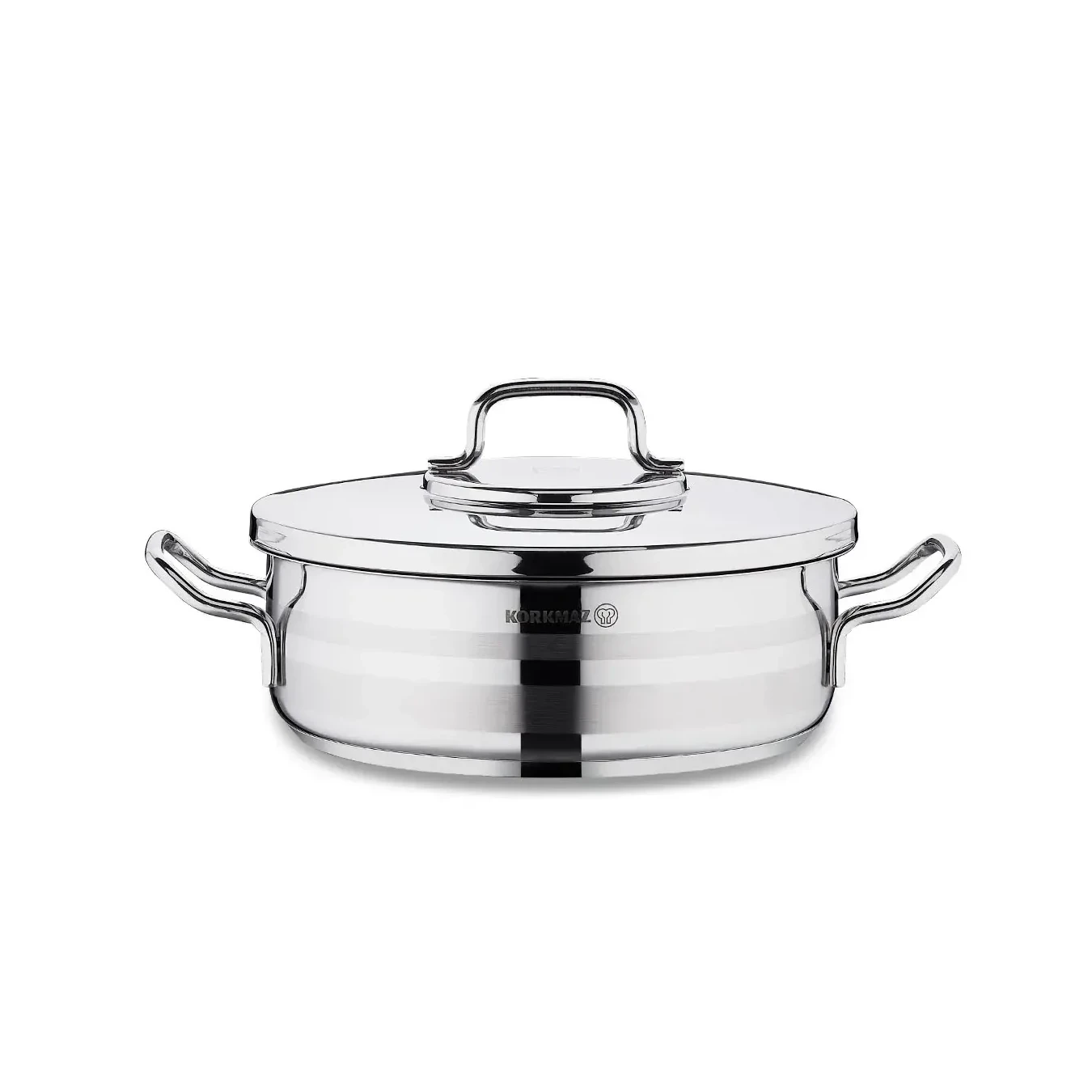 تابه استیل کرکماز مدل آسترا ASTRA2 A2041 محصولی از برند زیبای KORKMAZ کشور ترکیه است. جنس این تابه از استیل ضد زنگ نیکل-کروم 10\18 ساخته شده که علاوه بر ظاهری زیبا و براق دارای بدنه ای مستحکم نیز می باشد. جنس درب تابه و دستگیره ها نیز از استیل ضد زنگ است. دستگیره ها دارای نوعی اتصال هستند که در اثر حرارت داغ نمی شوند و همچنین دارای طراحی ارگونومیک هستند که کار با آن ها بسیار راحت است.