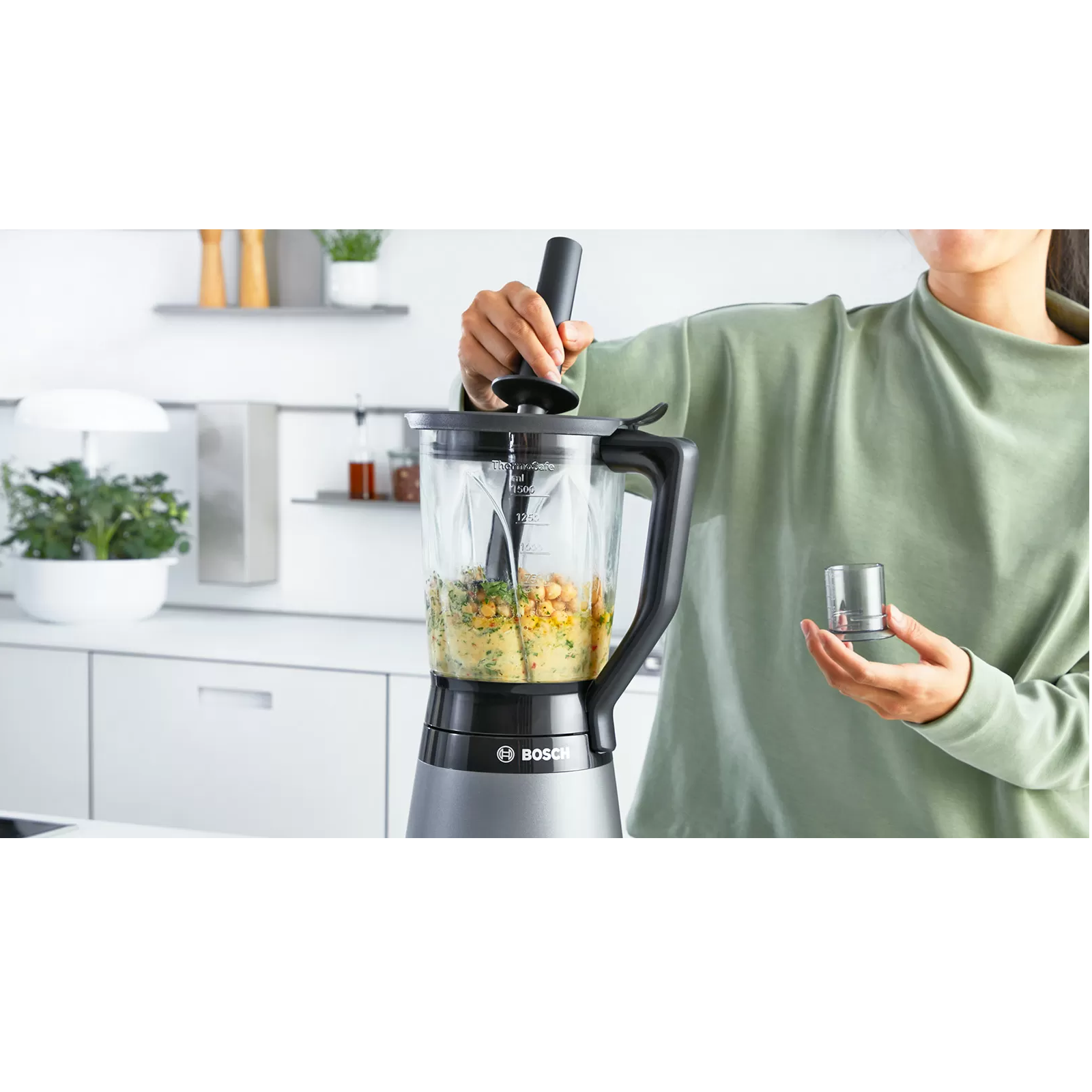 برای تمیز کردن و استفاده آسان از مخلوط کن مدل MMB6172S بوش تمامی قطعات آن قابل شستشو در ماشین ظرفشویی هستند. به همراه مخلوط کن یک اهرم فشار دهنده چند منظوره برای پایین نگه داشتن مواد در داخل پارچ، بدون اینکه نیازی به باز کردن درب آن باشد، وجود دارد.